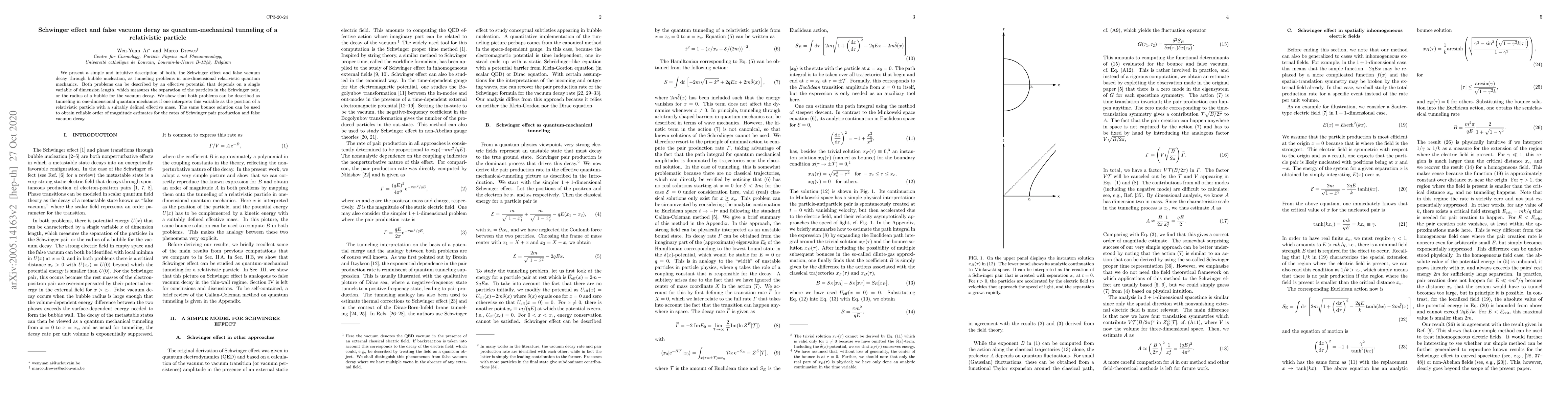 We present a simple and intuitive description of both, the Schwinger effect and false vacuum decay through bubble nucleation, as tunneling problems in one-dimensional relativistic quantum mechanics. Both problems can be described by an effective potential that depends on a single variable of dimension length, which measures the separation of the particles in the Schwinger pair, or the radius of a bubble for the vacuum decay. We show that both problems can be described as tunneling in one-dimensional quantum mechanics if one interprets this variable as the position of a relativistic particle with a suitably defined effective mass. The same bounce solution can be used to obtain reliable order of magnitude estimates for the rates of the Schwinger pair production and false vacuum decay.