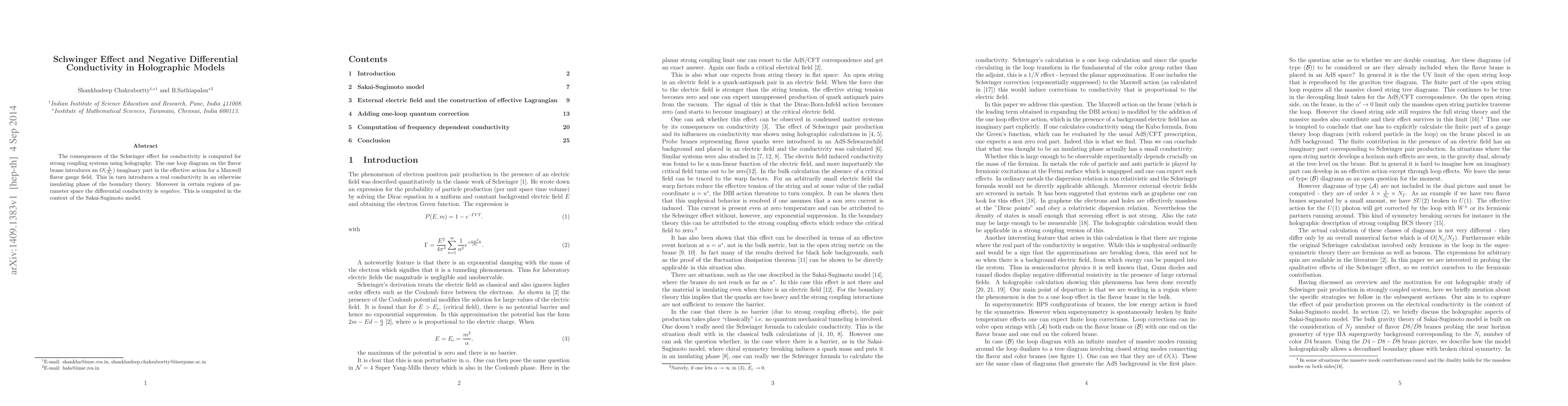 The consequences of the Schwinger effect for conductivity is computed for strong coupling systems using holography. The one loop diagram on the flavor brane introduces an $O({\lambda \over N_c})$ imaginary part in the effective action for a Maxwell flavor gauge field. This in turn introduces a real conductivity in an otherwise insulating phase of the boundary theory. Moreover in certain regions of parameter space the differential conductivity is negative. This is computed in the context of the Sakai-Sugimoto model.