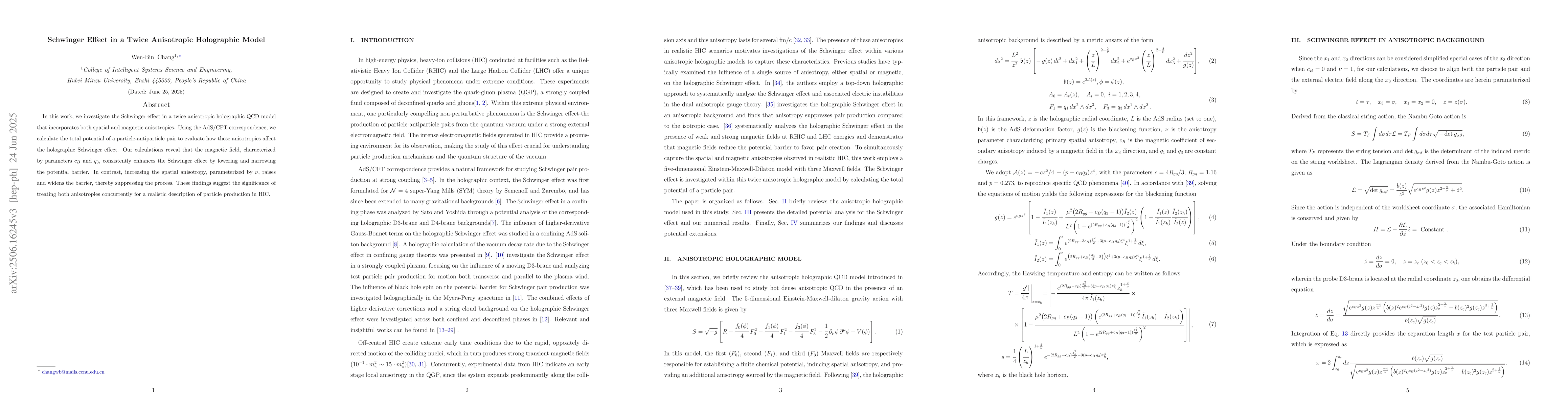 In this work, we investigate the Schwinger effect in a twice anisotropic holographic QCD model that incorporates both spatial and magnetic anisotropies. Using the AdS/CFT correspondence, we calculate the total potential of a particle-antiparticle pair to evaluate how these anisotropies affect the holographic Schwinger effect. Our calculations reveal that the magnetic field, characterized by parameters $c_B$ and $q_3$, consistently enhances the Schwinger effect by lowering and narrowing the potential barrier. In contrast, increasing the spatial anisotropy, parameterized by $\nu$, raises and widens the barrier, thereby suppressing the process. These findings suggest the significance of treating both anisotropies concurrently for a realistic description of particle production in HIC.