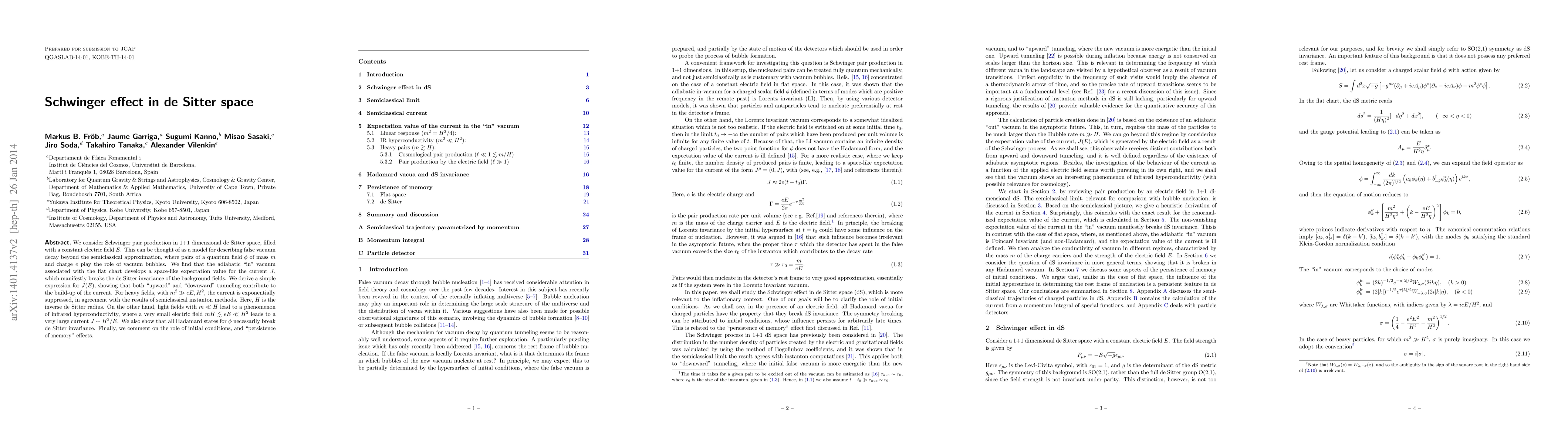 We consider Schwinger pair production in 1+1 dimensional de Sitter space, filled with a constant electric field $E$. This can be thought of as a model for describing false vacuum decay beyond the semiclassical approximation, where pairs of a quantum field $\phi$ of mass $m$ and charge $e$ play the role of vacuum bubbles. We find that the adiabatic "in" vacuum associated with the flat chart develops a space-like expectation value for the current $J$, which manifestly breaks the de Sitter invariance of the background fields. We derive a simple expression for $J(E)$, showing that both "upward" and "downward" tunneling contribute to the build-up of the current. For heavy fields, with $m^2\gg eE,H^2$, the current is exponentially suppressed, in agreement with the results of semiclassical instanton methods. Here $H$ is the inverse de Sitter radius. On the other hand, light fields with $ m \ll H$ lead to a phenomenon of infrared hyperconductivity, where a very small electric field $mH \lesssim eE \ll H^2$ leads to a very large current $J \sim H^3 /E$. We also show that all Hadamard states for $\phi$ necessarily break de Sitter invariance. Finally, we comment on the role of initial conditions, and "persistence of memory" effects.