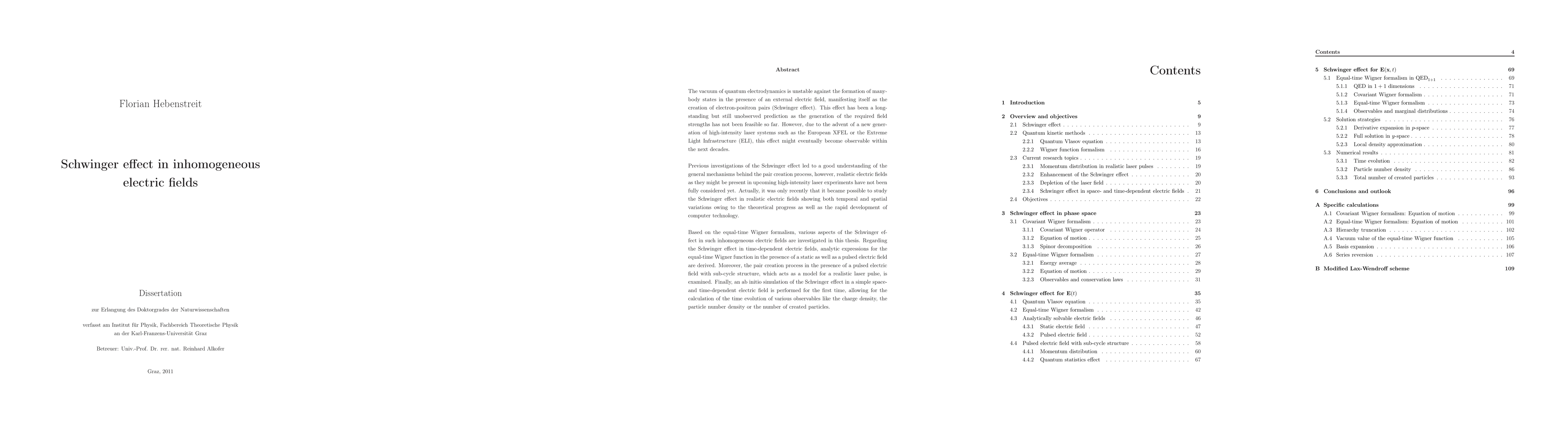 This paper investigates the Schwinger effect in varying electric fields, focusing on the creation of electron-positron pairs in quantum electrodynamics. It derives analytic expressions for the equal-time Wigner function in static and pulsed fields, and performs an ab initio simulation to study the time evolution of observables in a space- and time-dependent electric field.