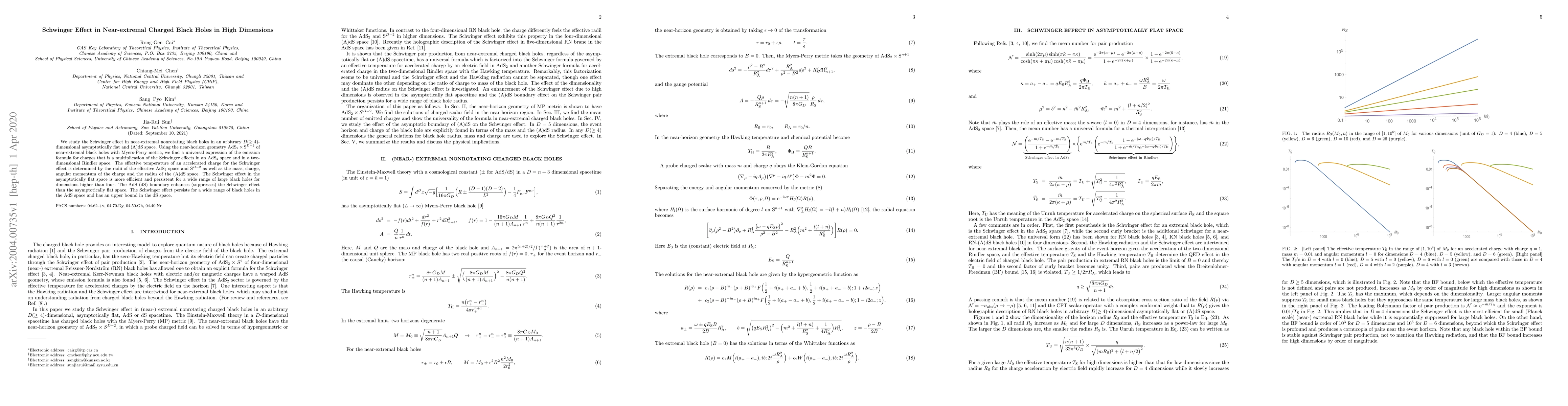 This research investigates the Schwinger effect in high-dimensional near-extremal black holes, finding a universal emission formula dependent on the black hole's parameters and effective AdS and S spaces. The AdS boundary enhances the effect, while the dS boundary suppresses it, with efficiency increasing in higher dimensions.