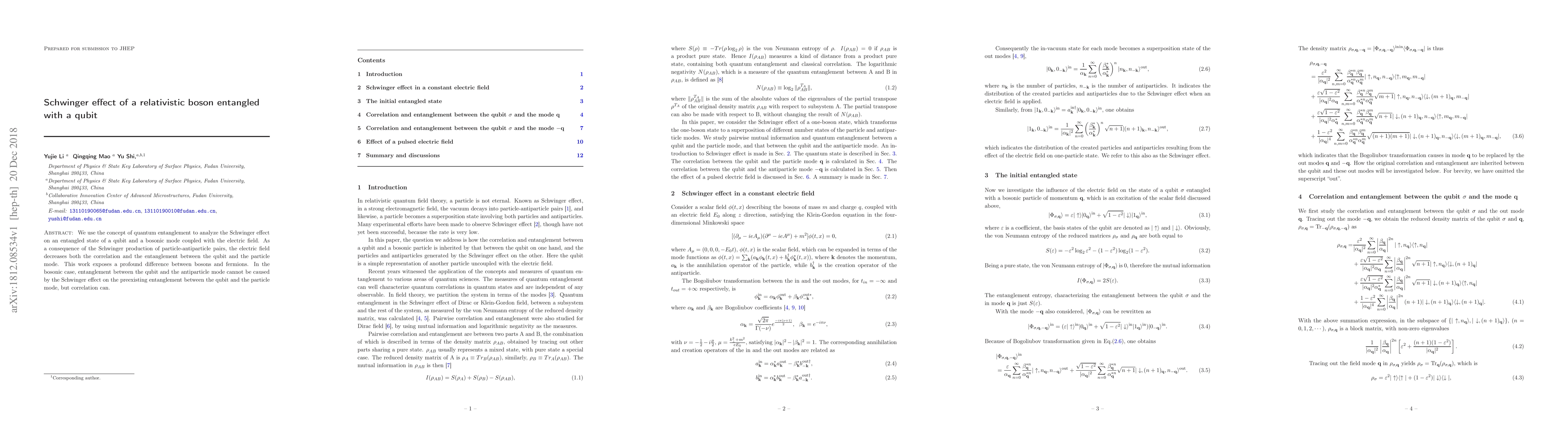 We use the concept of quantum entanglement to analyze the Schwinger effect on an entangled state of a qubit and a bosonic mode coupled with the electric field. As a consequence of the Schwinger production of particle-antiparticle pairs, the electric field decreases both the correlation and the entanglement between the qubit and the particle mode. This work exposes a profound difference between bosons and fermions. In the bosonic case, entanglement between the qubit and the antiparticle mode cannot be caused by the Schwinger effect on the preexisting entanglement between the qubit and the particle mode, but correlation can.