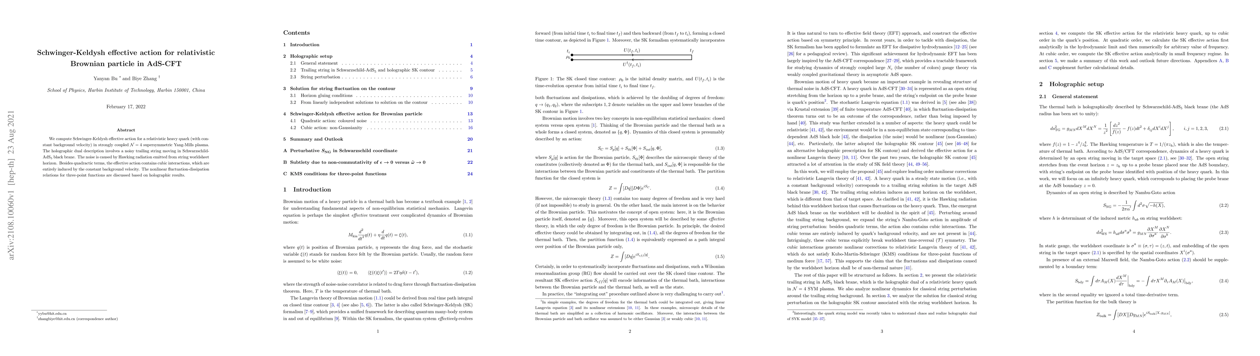 We compute Schwinger-Keldysh effective action for a relativistic heavy quark (with constant background velocity) in strongly coupled N = 4 supersymmetric Yang-Mills plasma. The holographic dual description involves a noisy trailing string moving in Schwarzschild-AdS5 black brane. The noise is caused by Hawking radiation emitted from string worldsheet horizon. Besides quadractic terms, the effective action contains cubic interactions, which are entirely induced by the constant background velocity. The nonlinear fluctuation-dissipation relations for three-point functions are discussed based on holographic results.