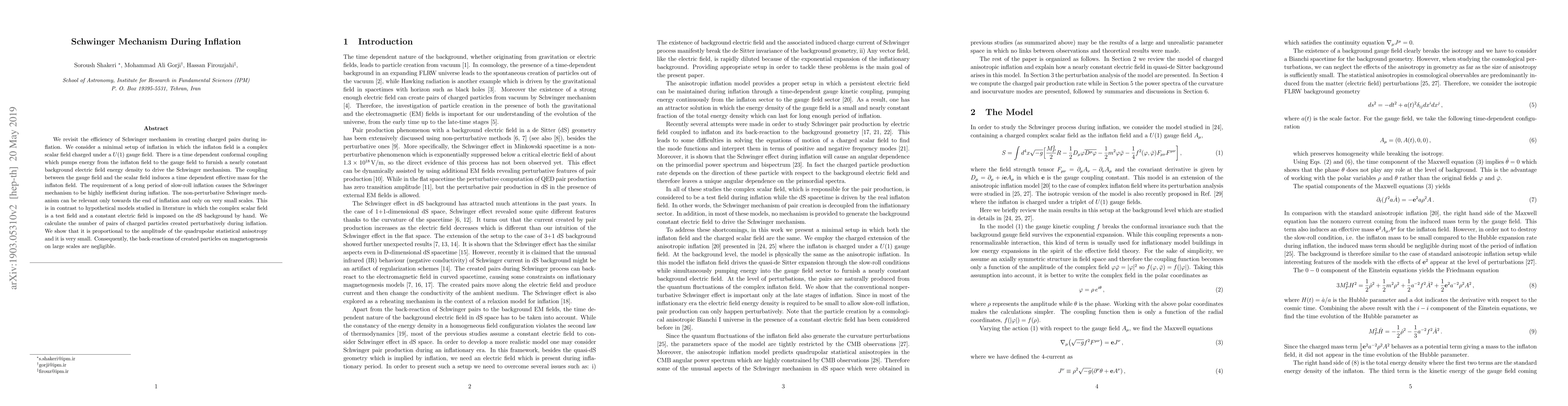 We revisit the efficiency of Schwinger mechanism in creating charged pairs during inflation. We consider a minimal setup of inflation in which the inflaton field is a complex scalar field charged under a $U(1)$ gauge field. There is a time dependent conformal coupling which pumps energy from the inflaton field to the gauge field to furnish a nearly constant background electric field energy density to drive the Schwinger mechanism. The coupling between the gauge field and the scalar field induces a time dependent effective mass for the inflaton field. The requirement of a long period of slow-roll inflation causes the Schwinger mechanism to be highly inefficient during inflation. The non-perturbative Schwinger mechanism can be relevant only towards the end of inflation and only on very small scales. This is in contrast to hypothetical models studied in literature in which the complex scalar field is a test field and a constant electric field is imposed on the dS background by hand. We calculate the number of pairs of charged particles created perturbatively during inflation. We show that it is proportional to the amplitude of the quadrupolar statistical anisotropy and it is very small. Consequently, the back-reactions of created particles on magnetogenesis on large scales are negligible.