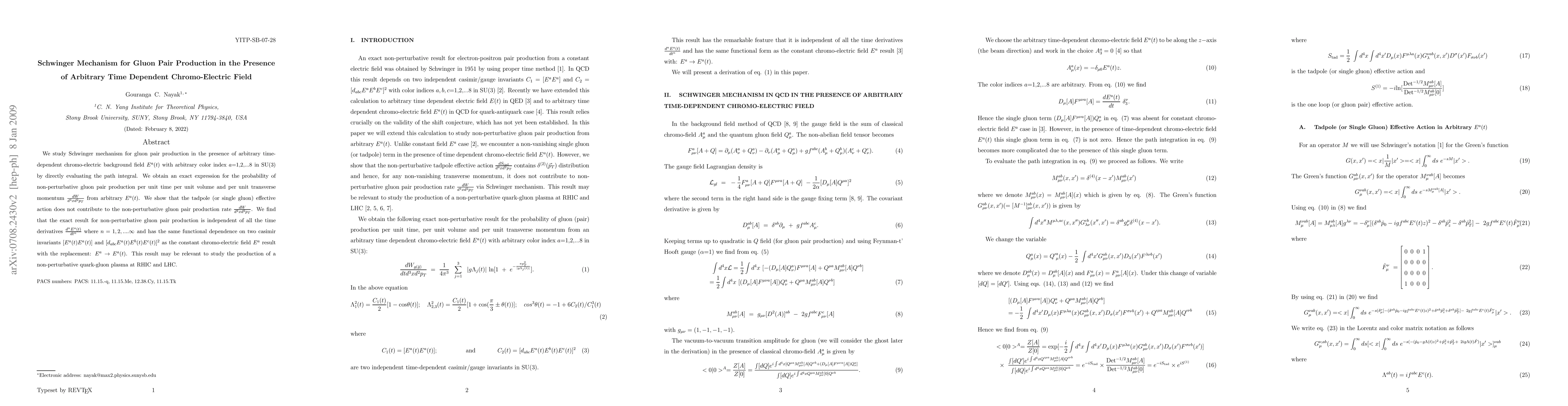 This paper investigates the Schwinger mechanism for gluon pair production under an arbitrary time-dependent chromo-electric field, deriving an exact expression for the non-perturbative production rate. The study finds that the production rate is independent of time derivatives and depends on two Casimir invariants, suggesting relevance for non-perturbative quark-gluon plasma studies at RHIC and LHC.
