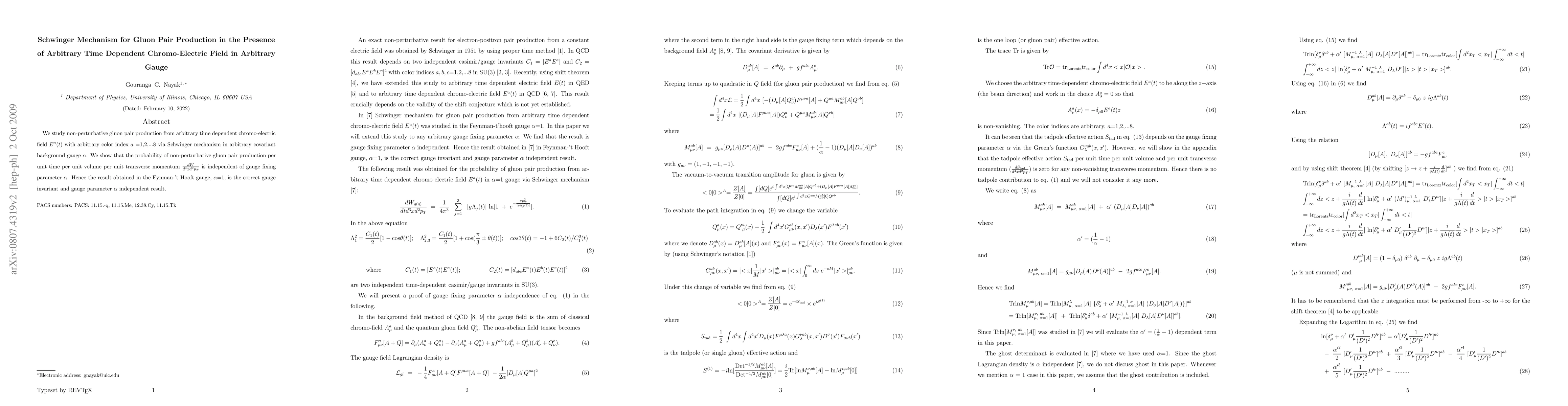 This paper investigates non-perturbative gluon pair production driven by an arbitrary time-dependent chromo-electric field using the Schwinger mechanism in an arbitrary covariant gauge. The study finds that the probability of such production is independent of the gauge fixing parameter, confirming the gauge invariance of the results.