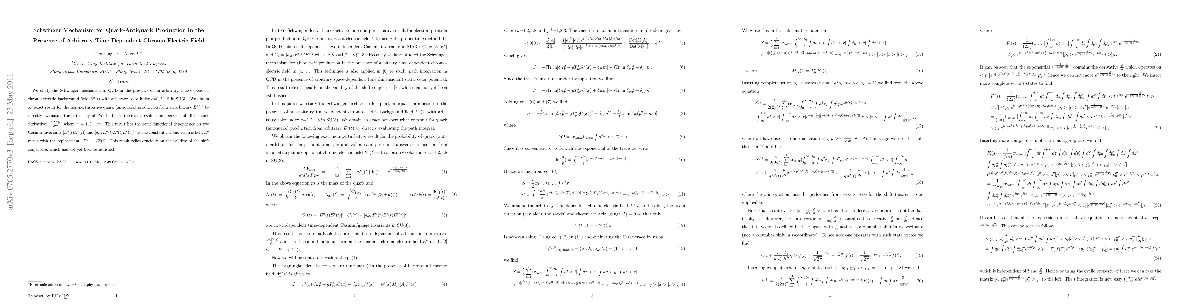 This paper investigates the Schwinger mechanism in QCD under an arbitrary time-dependent chromo-electric field, deriving an exact result for quark-antiquark production independent of time derivatives. The result depends on two Casimir invariants, mirroring the constant field case, but hinges on the yet unproven shift conjecture.