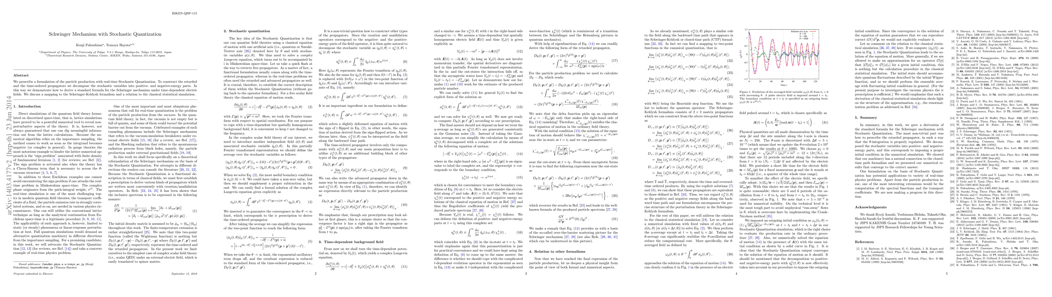 We prescribe a formulation of the particle production with real-time Stochastic Quantization. To construct the retarded and the time-ordered propagators we decompose the stochastic variables into positive- and negative-energy parts. In this way we demonstrate how to derive a standard formula for the Schwinger mechanism under time-dependent electric fields. We discuss a mapping to the Schwinger-Keldysh formalism and a relation to the classical statistical simulation.