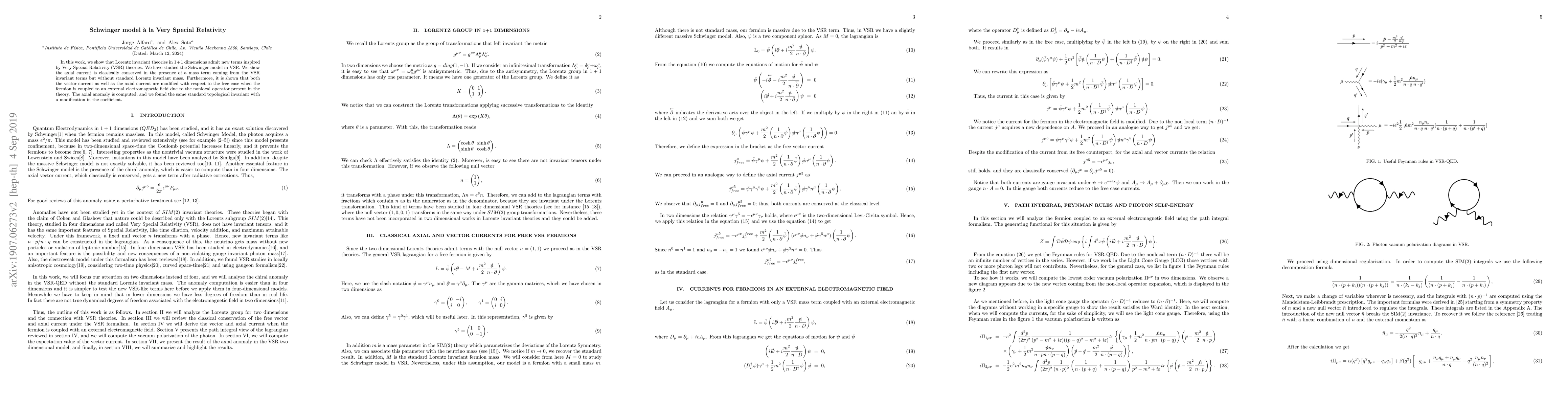 This paper explores Lorentz invariant theories in $1+1$ dimensions incorporating terms inspired by Very Special Relativity (VSR) in the Schwinger model. It demonstrates that the axial current remains classically conserved with a VSR-derived mass term, while both vector and axial currents are modified by a nonlocal operator when coupled to an external electromagnetic field, and the axial anomaly is slightly modified in its coefficient.