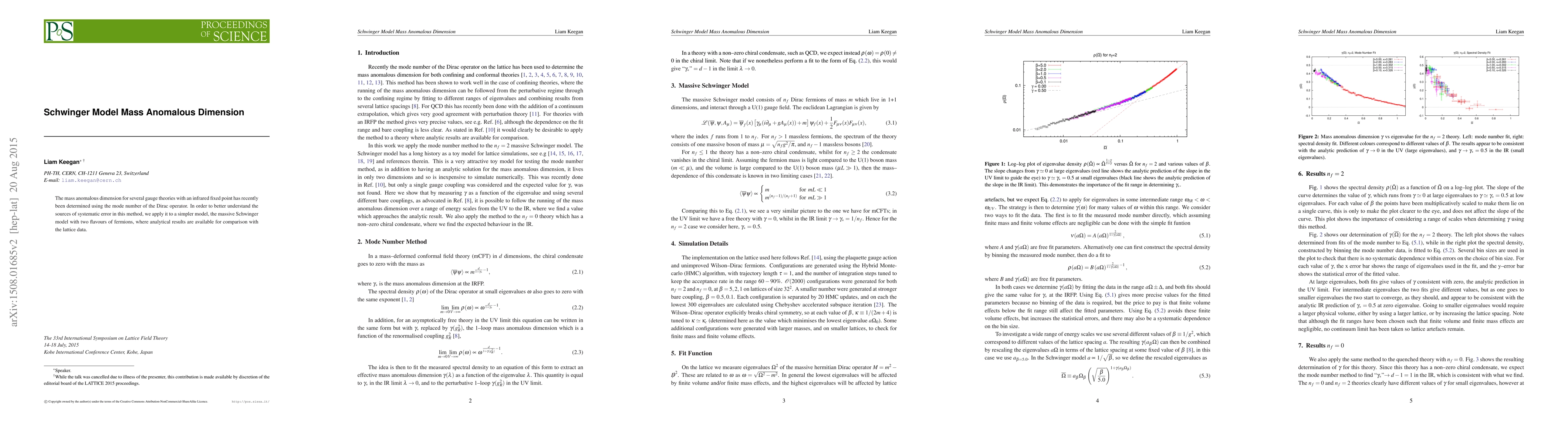 The mass anomalous dimension for several gauge theories with an infrared fixed point has recently been determined using the mode number of the Dirac operator. In order to better understand the sources of systematic error in this method, we apply it to a simpler model, the massive Schwinger model with two flavours of fermions, where analytical results are available for comparison with the lattice data.