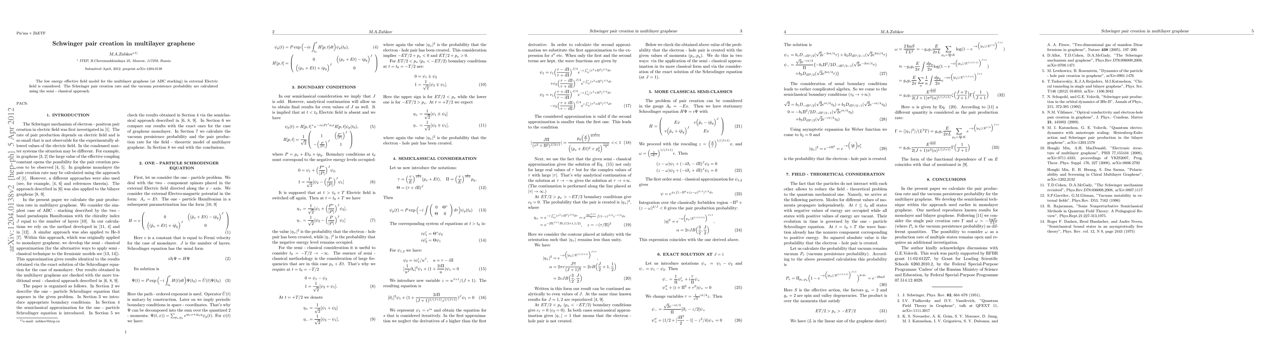 This paper investigates the Schwinger pair creation phenomenon in multilayer graphene under an external electric field, employing a low-energy effective field model and semi-classical approach to calculate the pair creation rate and vacuum persistence probability.