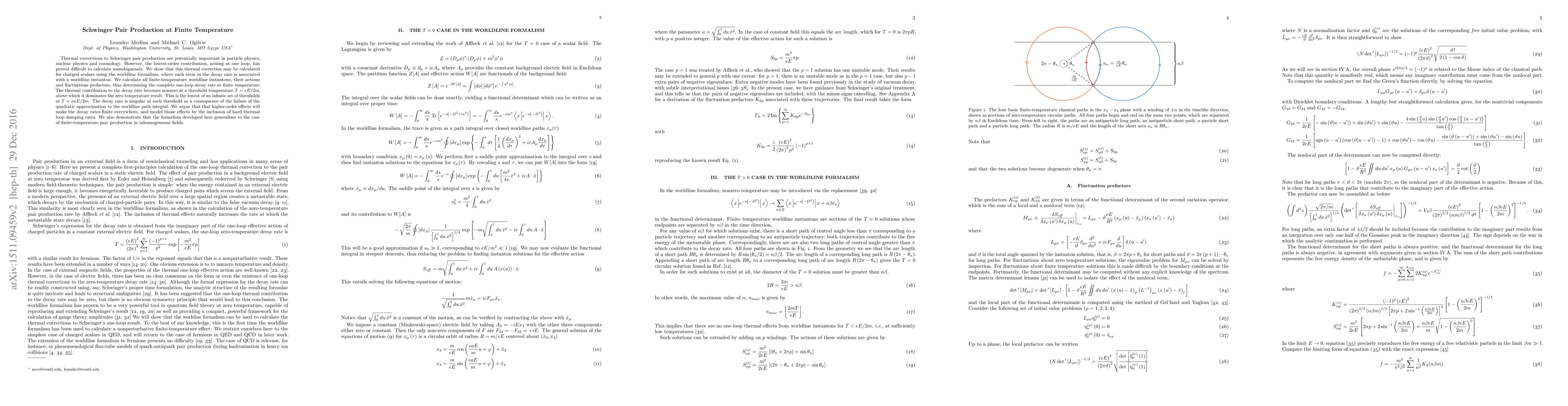 This paper calculates the thermal correction to Schwinger pair production using the worldline formalism, determining the complete one-loop decay rate at finite temperature. It finds that the thermal contribution becomes significant above a threshold temperature $T=eE/2m$, and the decay rate becomes singular at each threshold due to the failure of the quadratic approximation.