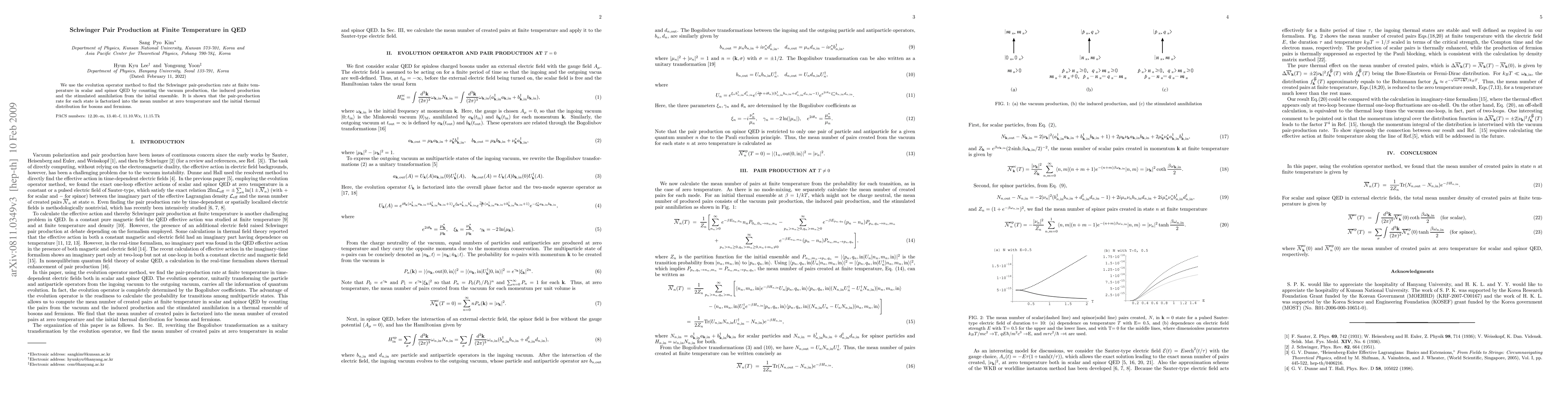 This paper employs the evolution operator method to determine the Schwinger pair-production rate at finite temperature in both scalar and spinor QED, revealing that the rate factorizes into the zero-temperature mean number and the initial thermal distribution for bosons and fermions.