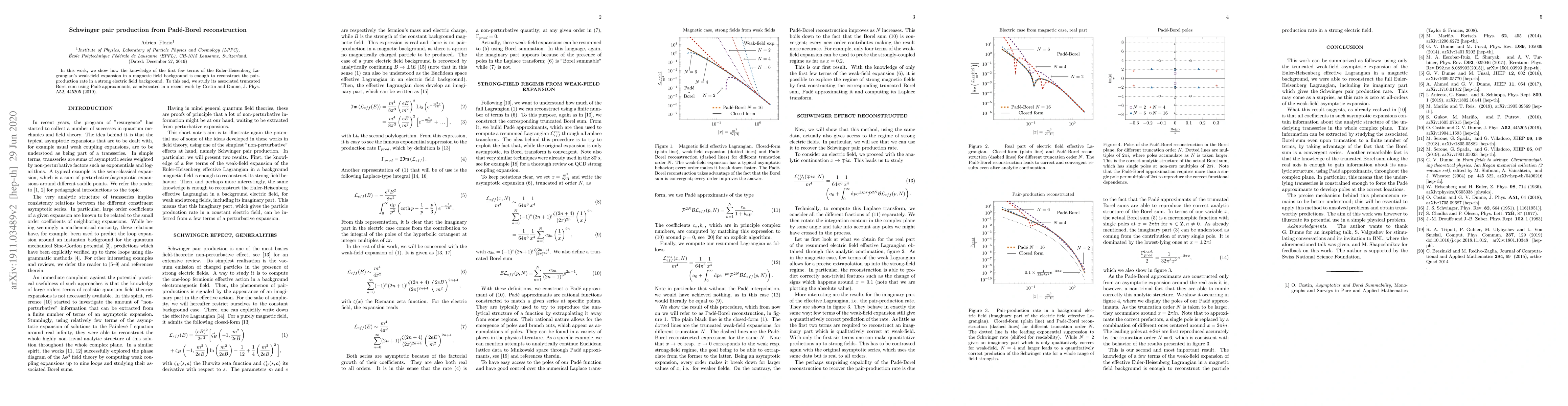 In this work, we show how the knowledge of the first few terms of the Euler-Heisenberg Lagrangian's weak-field expansion in a magnetic field background is enough to reconstruct the pair-production rate in a strong electric field background. To this end, we study its associated truncated Borel sum using Pad\'e approximants, as advocated in a recent work by Costin and Dunne, J. Phys. A52, 445205 (2019).