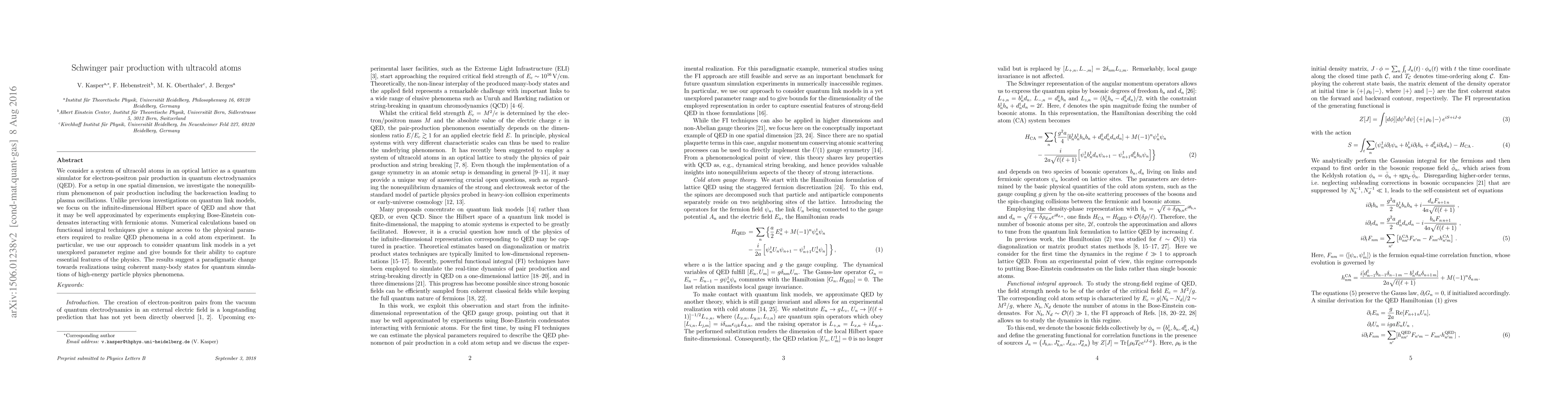 This paper explores ultracold atoms in an optical lattice as a quantum simulator for QED pair production, demonstrating that Bose-Einstein condensates interacting with fermionic atoms can approximate the infinite-dimensional Hilbert space of QED. The study provides new insights into the feasibility of simulating high-energy particle physics using coherent many-body states.