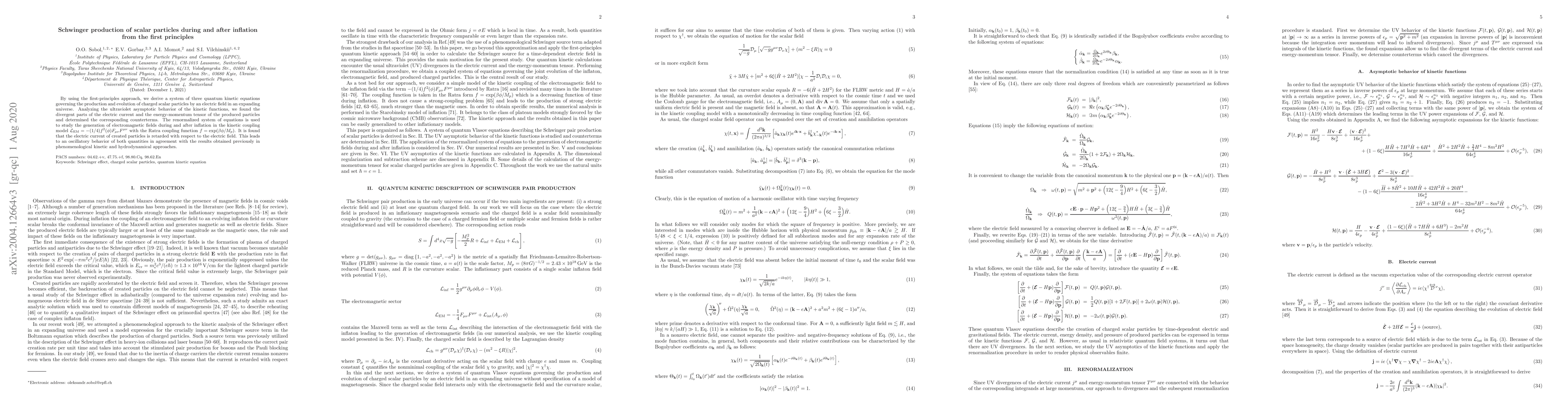 This paper derives quantum kinetic equations for charged scalar particles produced by electric fields in an expanding universe, determining counterterms for divergent parts. It studies electromagnetic field generation during and post-inflation, finding oscillatory behavior of electric current and fields in the kinetic coupling model.