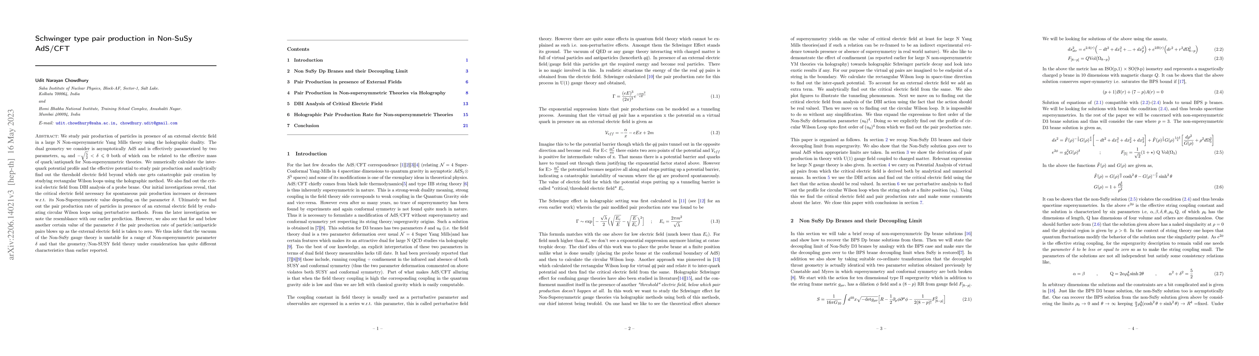 We study pair production of particles in presence of an external electric field in a large N Non-supersymmetric Yang Mills theory using the holographic duality. We numerically calculate the inter-quark potential profile and the effective potential to study pair production and analytically find out the threshold electric field beyond which one gets catastrophic pair creation by studying rectangular Wilson loops using the holographic method. We also find out the pair production rate of particles in presence of an external electric field by evaluating circular Wilson loops using perturbative methods. We infer that the vacuum of the Non-SuSy gauge theory is unstable for a range of Non-supersymmetric parameter.