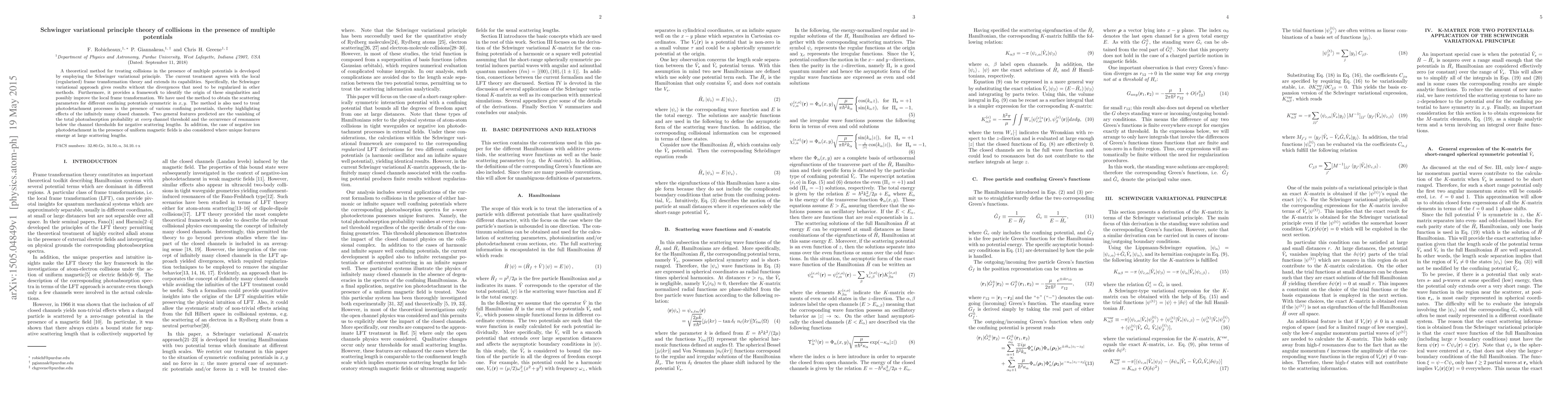 A theoretical method for treating collisions in the presence of multiple potentials is developed by employing the Schwinger variational principle. The current treatment agrees with the local (regularized) frame transformation theory and extends its capabilities. Specifically, the Schwinger variational approach gives results without the divergences that need to be regularized in other methods. Furthermore, it provides a framework to identify the origin of these singularities and possibly improve the local frame transformation. We have used the method to obtain the scattering parameters for different confining potentials symmetric in $x,y$. The method is also used to treat photodetachment processes in the presence of various confining potentials, thereby highlighting effects of the infinitely many closed channels. Two general features predicted are the vanishing of the total photoabsorption probability at {\it every} channel threshold and the occurrence of resonances below the channel thresholds for negative scattering lengths. In addition, the case of negative ion photodetachment in the presence of uniform magnetic fields is also considered where unique features emerge at large scattering lengths.