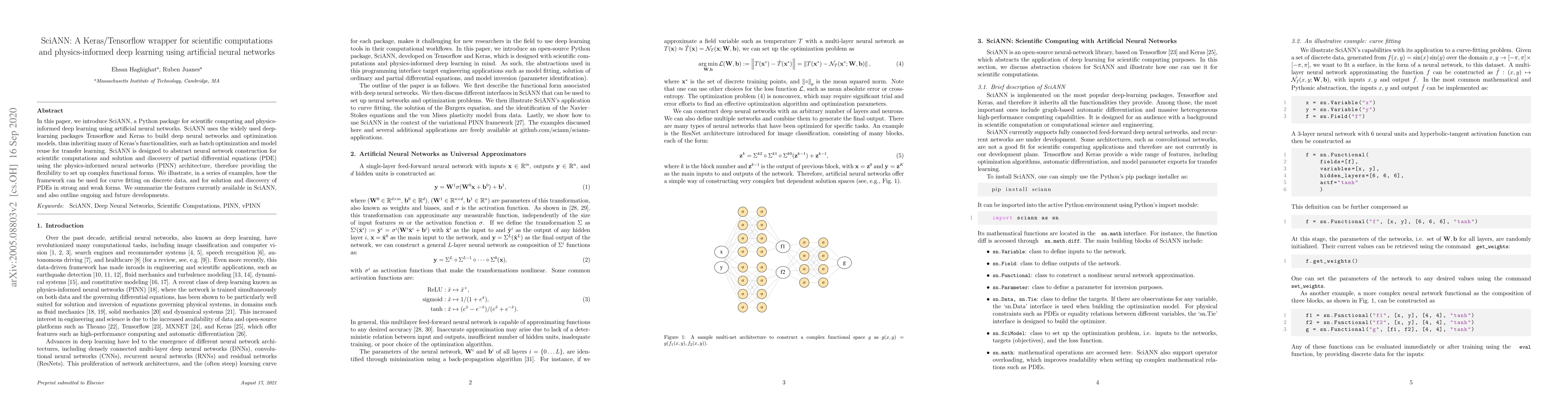 SciANN is a Python package leveraging Tensorflow and Keras for scientific computing and physics-informed deep learning, facilitating the construction of neural networks for solving partial differential equations and curve fitting. It abstracts complex neural network setups and outlines future enhancements.