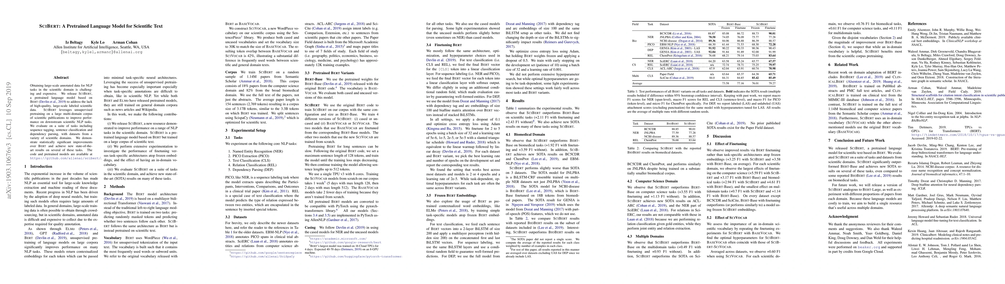 Obtaining large-scale annotated data for NLP tasks in the scientific domain is challenging and expensive. We release SciBERT, a pretrained language model based on BERT (Devlin et al., 2018) to address the lack of high-quality, large-scale labeled scientific data. SciBERT leverages unsupervised pretraining on a large multi-domain corpus of scientific publications to improve performance on downstream scientific NLP tasks. We evaluate on a suite of tasks including sequence tagging, sentence classification and dependency parsing, with datasets from a variety of scientific domains. We demonstrate statistically significant improvements over BERT and achieve new state-of-the-art results on several of these tasks. The code and pretrained models are available at https://github.com/allenai/scibert/.