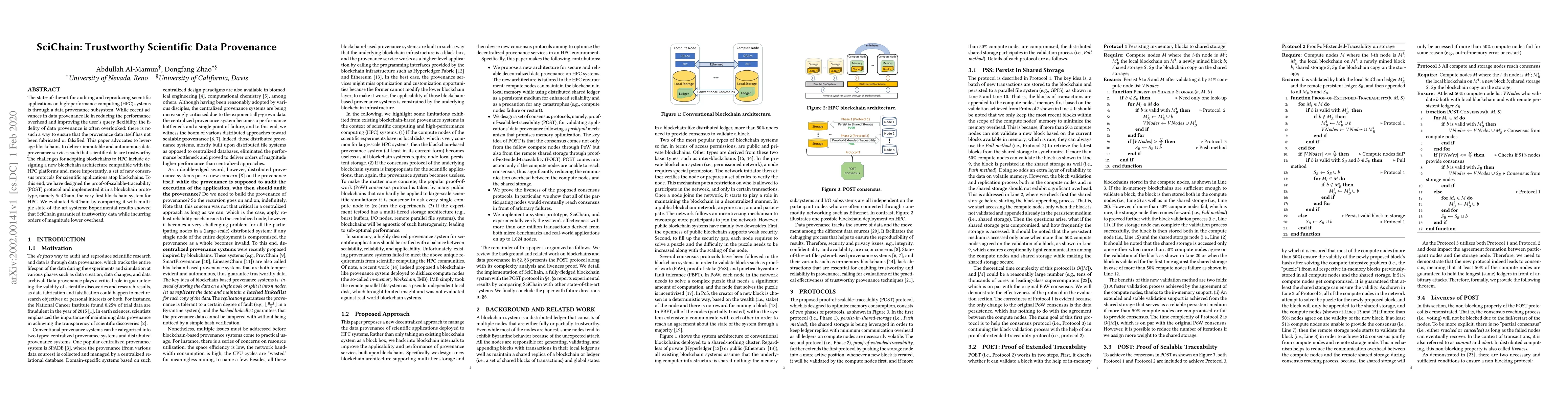 SciChain introduces a blockchain-based system to ensure trustworthy scientific data provenance in high-performance computing, addressing the lack of fidelity in existing data provenance methods. The proposed POST protocol and prototype demonstrate significantly lower overhead compared to state-of-the-art systems.