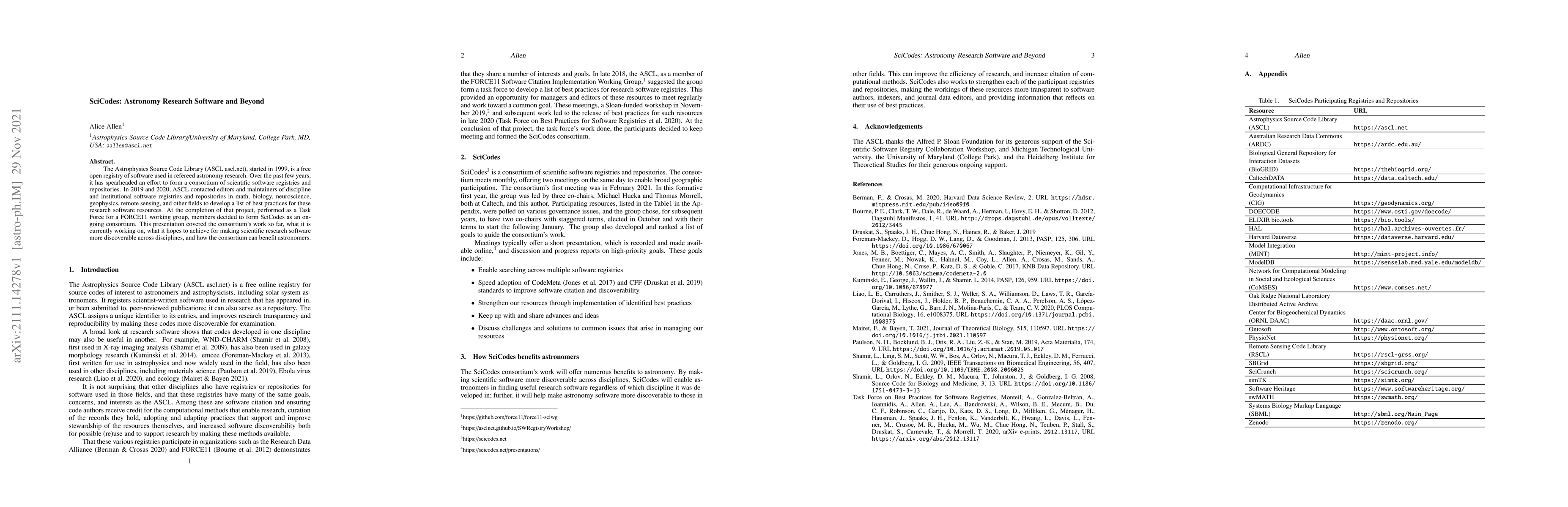 The SciCodes consortium aims to enhance the discoverability and usability of scientific research software across various disciplines by establishing best practices and fostering collaboration among software registries. The initiative, stemming from the Astrophysics Source Code Library, seeks to benefit astronomers and extend its impact to other fields.