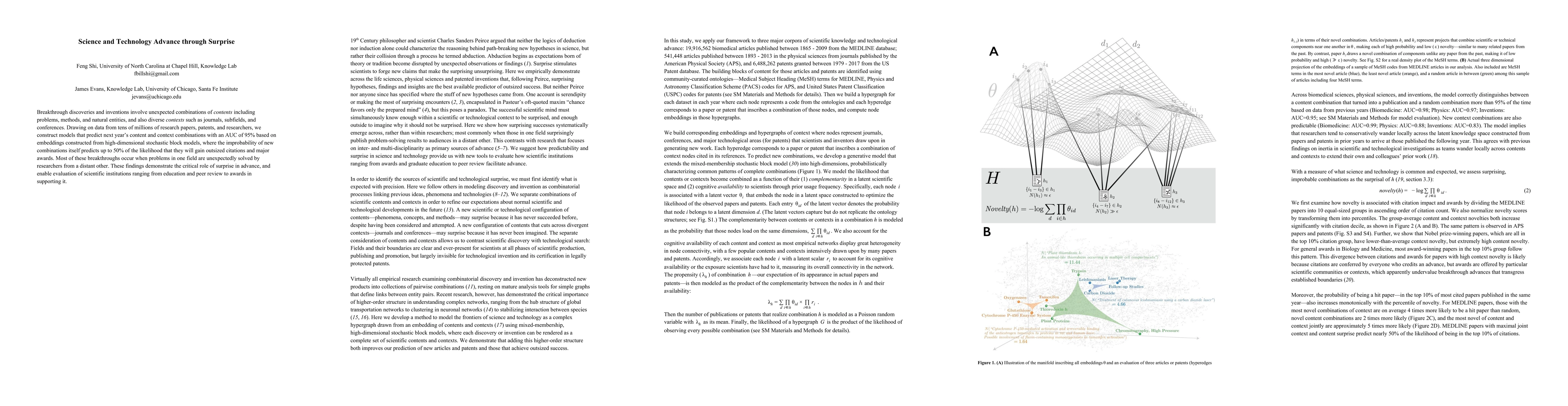 Breakthrough discoveries and inventions involve unexpected combinations of contents including problems, methods, and natural entities, and also diverse contexts such as journals, subfields, and conferences. Drawing on data from tens of millions of research papers, patents, and researchers, we construct models that predict next year's content and context combinations with an AUC of 95% based on embeddings constructed from high-dimensional stochastic block models, where the improbability of new combinations itself predicts up to 50% of the likelihood that they will gain outsized citations and major awards. Most of these breakthroughs occur when problems in one field are unexpectedly solved by researchers from a distant other. These findings demonstrate the critical role of surprise in advance, and enable evaluation of scientific institutions ranging from education and peer review to awards in supporting it.