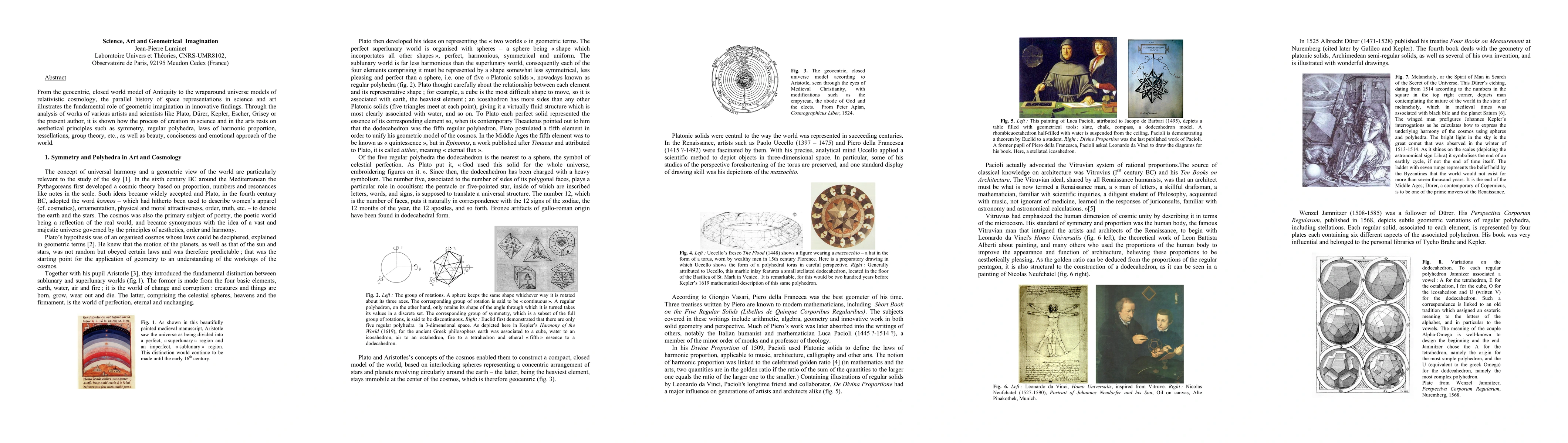 From the geocentric, closed world model of Antiquity to the wraparound universe models of relativistic cosmology, the parallel history of space representations in science and art illustrates the fundamental role of geometric imagination in innovative findings. Through the analysis of works of various artists and scientists like Plato, Durer, Kepler, Escher, Grisey or the present author, it is shown how the process of creation in science and in the arts rests on aesthetical principles such as symmetry, regular polyhedra, laws of harmonic proportion, tessellations, group theory, etc., as well as beauty, conciseness and emotional approach of the world.