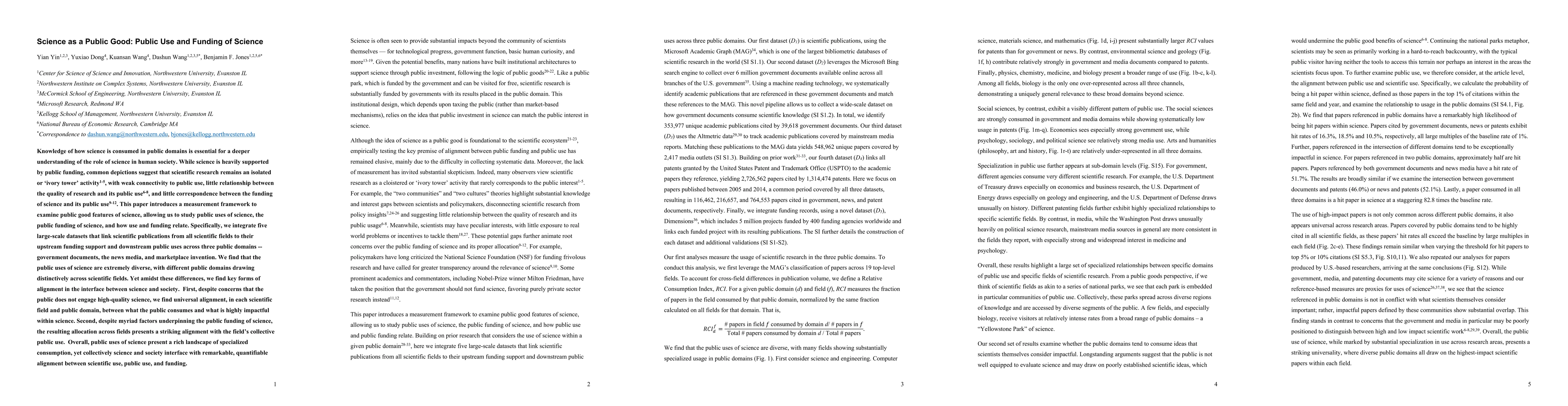 This paper develops a framework to measure the public good aspects of science, revealing diverse public uses across government, media, and marketplace domains. It finds that public consumption aligns with high-impact science and that public funding correlates strongly with the collective public use of scientific fields.