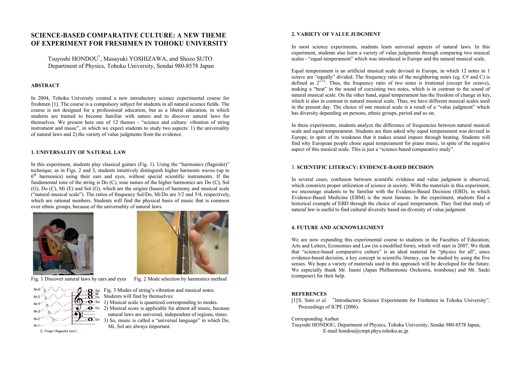 In 2004, Tohoku University created a new introductory science experimental course for freshmen. The course is a compulsory subject for students in all natural science fields. The course is not designed for a professional education, but as a liberal education, in which students are trained to become familiar with nature and to discover natural laws for themselves. We present here one of 12 themes - "science and culture: vibration of string instrument and music", in which we expect students to study two aspects: 1) the universality of natural laws and 2) the variety of value judgments from the evidence.