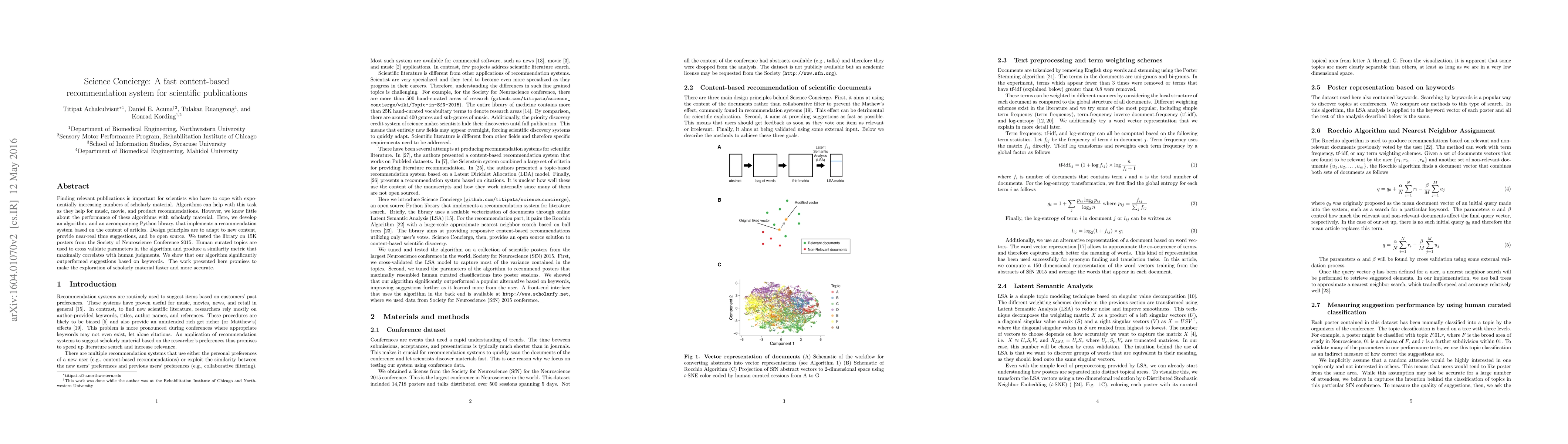 Finding relevant publications is important for scientists who have to cope with exponentially increasing numbers of scholarly material. Algorithms can help with this task as they help for music, movie, and product recommendations. However, we know little about the performance of these algorithms with scholarly material. Here, we develop an algorithm, and an accompanying Python library, that implements a recommendation system based on the content of articles. Design principles are to adapt to new content, provide near-real time suggestions, and be open source. We tested the library on 15K posters from the Society of Neuroscience Conference 2015. Human curated topics are used to cross validate parameters in the algorithm and produce a similarity metric that maximally correlates with human judgments. We show that our algorithm significantly outperformed suggestions based on keywords. The work presented here promises to make the exploration of scholarly material faster and more accurate.