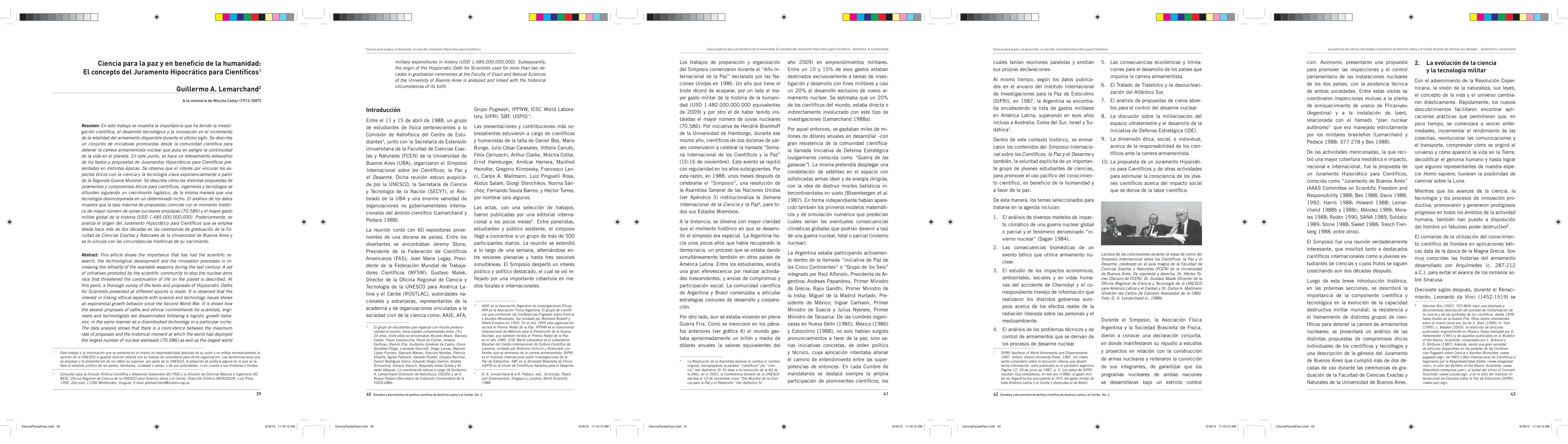This article shows the importance that has had the scientific research, the technological development and the innovation processes in increasing the lethality of the available weapons during the last century. A set of initiatives promoted by the scientific community to stop the nuclear arms race that threatened the continuation of life on the planet is described. At this point, a thorough survey of the texts and proposals of Hippocratic Oaths for Scientists presented at different epochs is made. It is observed that the interest in linking ethical aspects with science and technology issues shows an exponential growth behavior since the Second World War. It is shown how the several proposals of oaths and ethical commitments for scientists, engineers and technologists are disseminated following a logistic growth behavior, in the same manner as a disembodied technology in a particular niche. The data analysis shows that there is a coincidence between the maximum rate of proposals and the historical moment at which the world had deployed the largest number of nuclear warheads (70,586) as well as the largest world military expenditures in history (USD 1,485,000,000,000). Subsequently, the origin of the Hippocratic Oath for Scientists used for more than two decades in graduation ceremonies at the Faculty of Exact and Natural Sciences of the University of Buenos Aires is analyzed and linked with the historical circumstances of its birth.