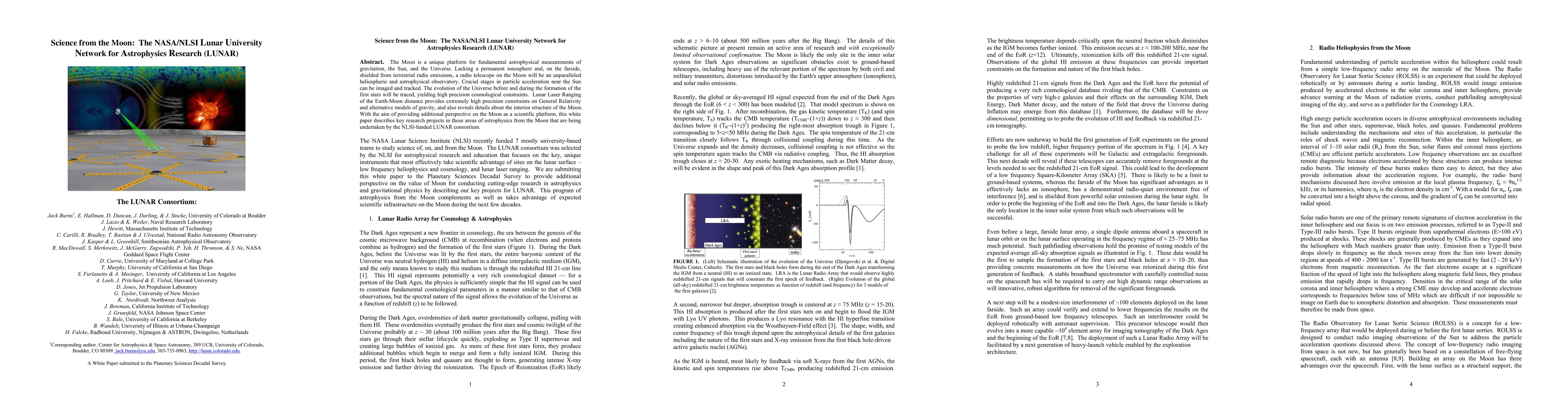 The LUNAR consortium, funded by NASA's Lunar Science Institute, aims to leverage the Moon as a unique platform for advanced astrophysical research, including heliophysics, cosmology, and gravitational physics. The Moon's lack of an ionosphere and radio emission shielding makes it ideal for unparalleled radio telescope observations and high precision cosmological studies.