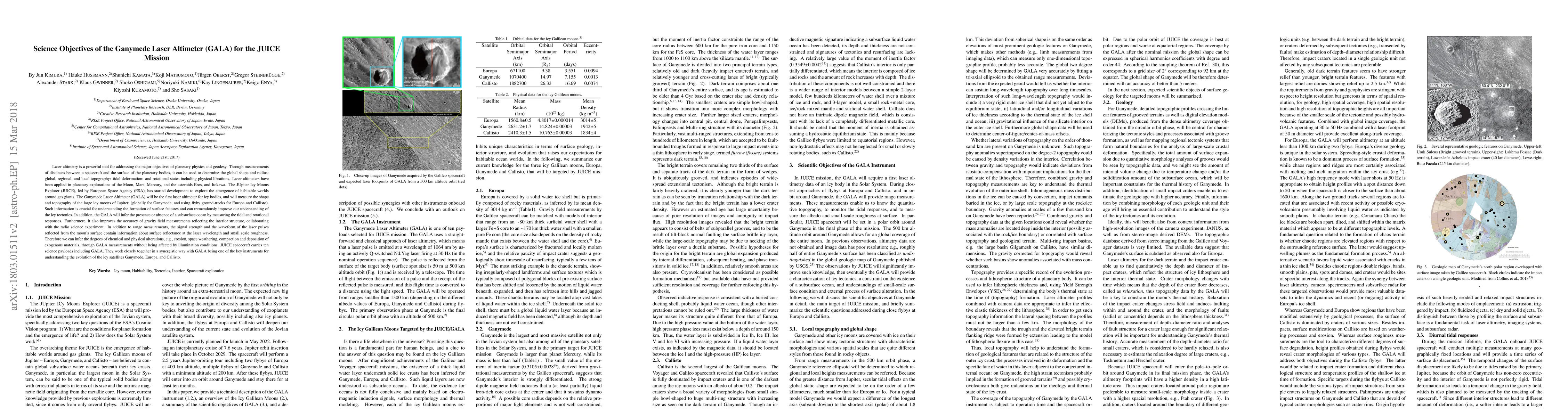 Laser altimetry is a powerful tool for addressing the major objectives of planetary physics and geodesy, and have been applied in planetary explorations of the Moon, Mars, Mercury, and the asteroids Eros, and Itokawa. The JUpiter Icy Moons Explorer (JUICE), led by European Space Agency (ESA), has started development to explore the emergence of habitable worlds around gas giants. The Ganymede Laser Altimeter (GALA) will be the first laser altimeter for icy bodies, and will measure the shape and topography of the large icy moons of Jupiter, (globally for Ganymede, and using flyby ground-tracks for Europa and Callisto). Such information is crucial for understanding the formation of surface features and can tremendously improve our understanding of the icy tectonics. In addition, the GALA will infer the presence or absence of a subsurface ocean by measuring the tidal and rotational responses. Furthermore, it also improves the accuracy of gravity field measurements reflecting the interior structure, collaborating with the radio science experiment. In addition to range measurements, the signal strength and the waveform of the laser pulses reflected from the moon's surface contain information about surface reflectance at the laser wavelength and small scale roughness. Therefore we can infer the degrees of chemical and physical alterations, e.g., erosion, space weathering, compaction and deposition of exogenous materials, through GALA measurements without being affected by illumination conditions. JUICE spacecraft carries ten science payloads including GALA. They work closely together in a synergistic way with GALA being one of the key instruments for understanding the evolution of the icy satellites Ganymede, Europa, and Callisto.