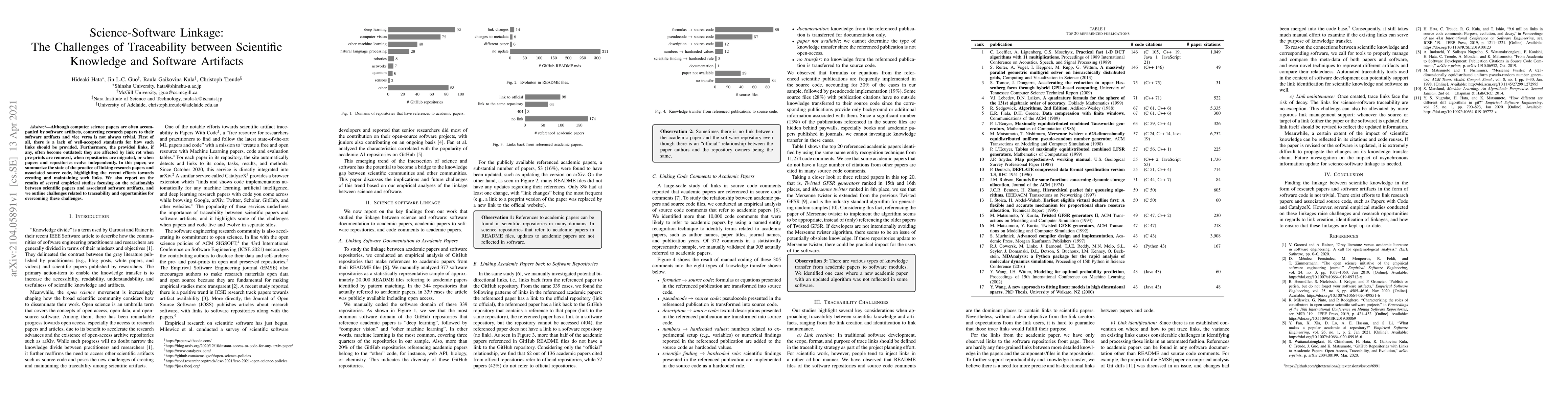 This paper discusses the difficulties in establishing and maintaining traceable links between scientific research papers and their corresponding software artifacts. It highlights the lack of standards and the issue of link rot, and presents empirical studies on the relationship between these elements, while also identifying challenges and potential solutions for improving traceability.