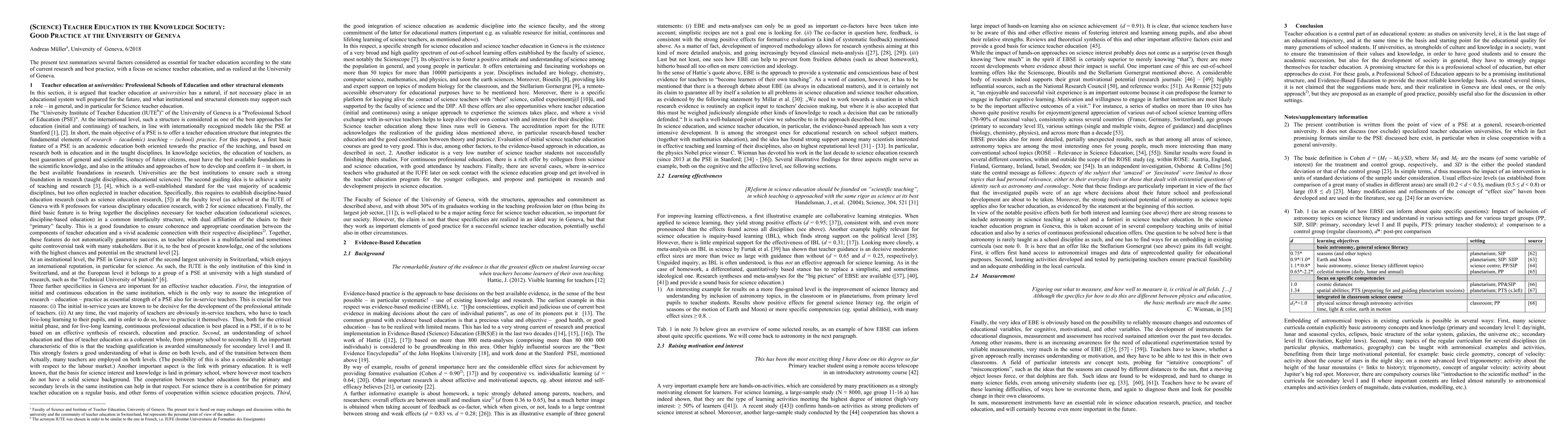 Summary: This paper outlines key elements of effective science teacher education, emphasizing best practices at the University of Geneva, based on current research and proven methodologies. It highlights the institution's approach to preparing science educators in a knowledge-driven society.