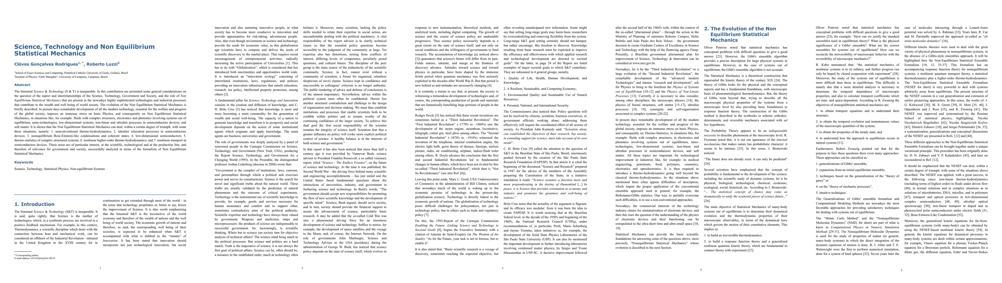 This paper explores the interconnectedness of Science, Technology, Government, and Society, emphasizing the role of Non Equilibrium Statistical Mechanics in modern technological advancements. It highlights the application of this field to complex systems, including nano-technologies and semiconductor devices, demonstrating its effectiveness in addressing non-equilibrium processes.