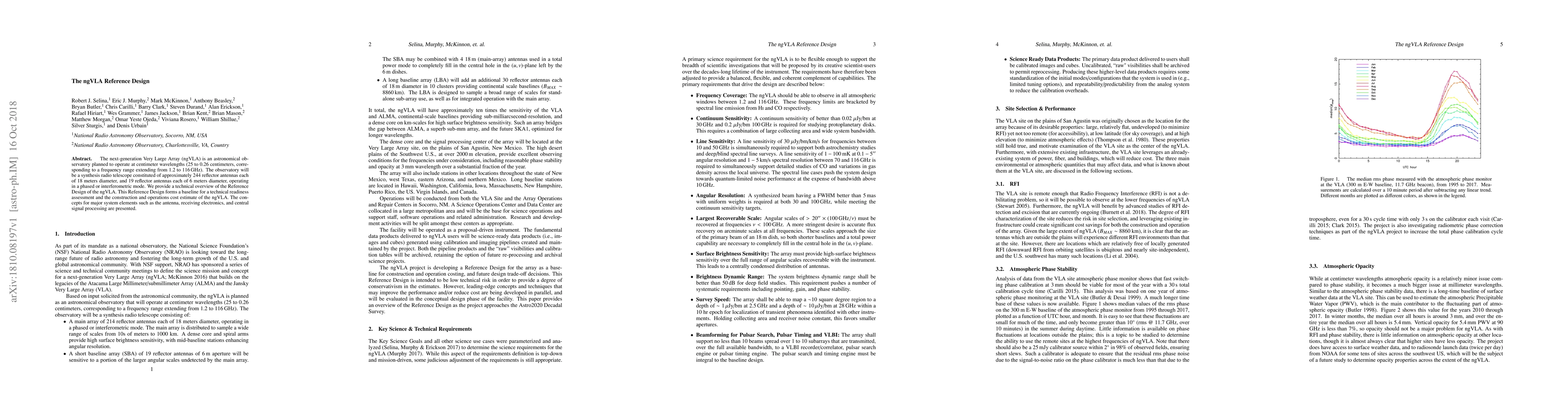The ngVLA Reference Design outlines the technical framework for a next-generation Very Large Array radio telescope operating at centimeter wavelengths, featuring a large array of reflector antennas and advanced signal processing for astronomical observations. This design serves as a baseline for evaluating construction costs and technical readiness.
