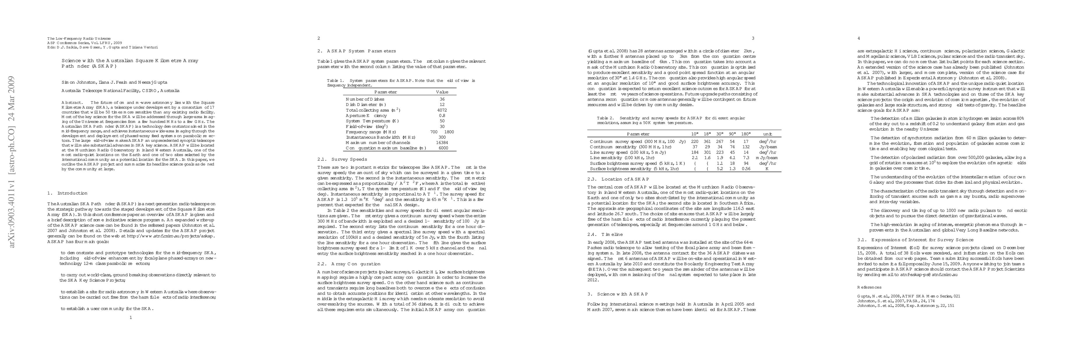 The Australian Square Kilometre Array Pathfinder (ASKAP) serves as a mid-frequency technology demonstrator for the upcoming Square Kilometre Array (SKA) telescope, aiming to achieve wide-area imaging and substantial advances in key science areas. ASKAP's large field-of-view and location in a highly radio-quiet region make it a powerful synoptic telescope.