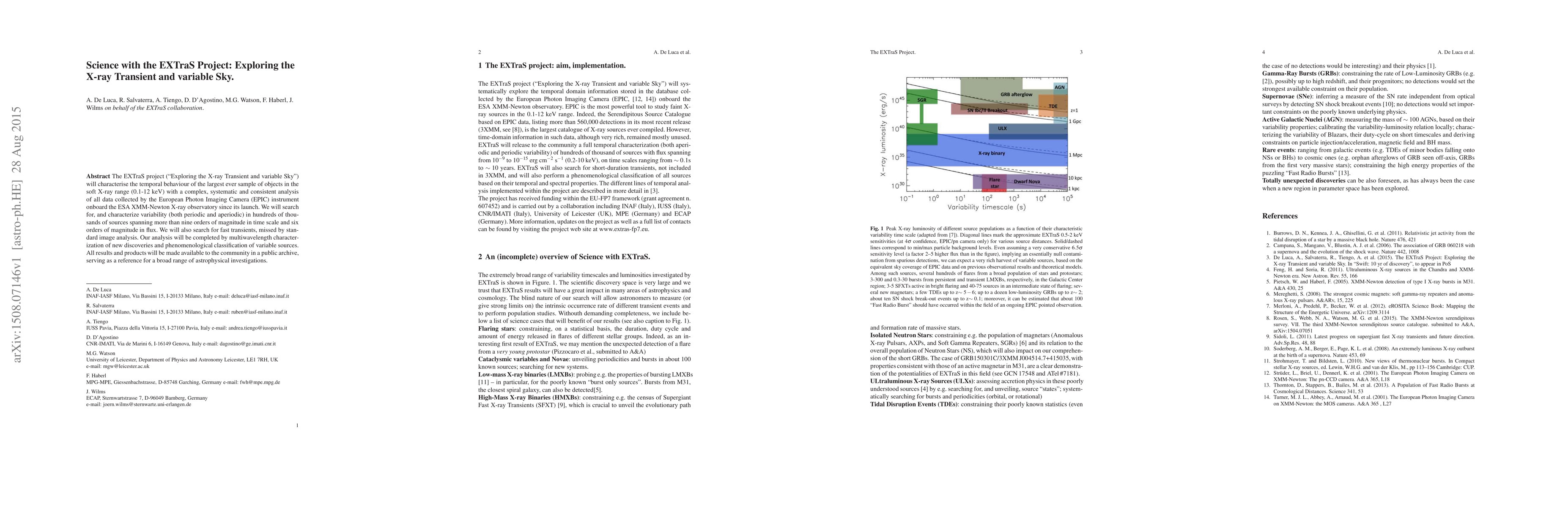 The EXTraS project (Exploring the X-ray Transient and variable Sky) will characterise the temporal behaviour of the largest ever sample of objects in the soft X-ray range (0.1-12 keV) with a complex, systematic and consistent analysis of all data collected by the European Photon Imaging Camera (EPIC) instrument onboard the ESA XMM-Newton X-ray observatory since its launch. We will search for, and characterize variability (both periodic and aperiodic) in hundreds of thousands of sources spanning more than nine orders of magnitude in time scale and six orders of magnitude in flux. We will also search for fast transients, missed by standard image analysis. Our analysis will be completed by multiwavelength characterization of new discoveries and phenomenological classification of variable sources. All results and products will be made available to the community in a public archive, serving as a reference for a broad range of astrophysical investigations.