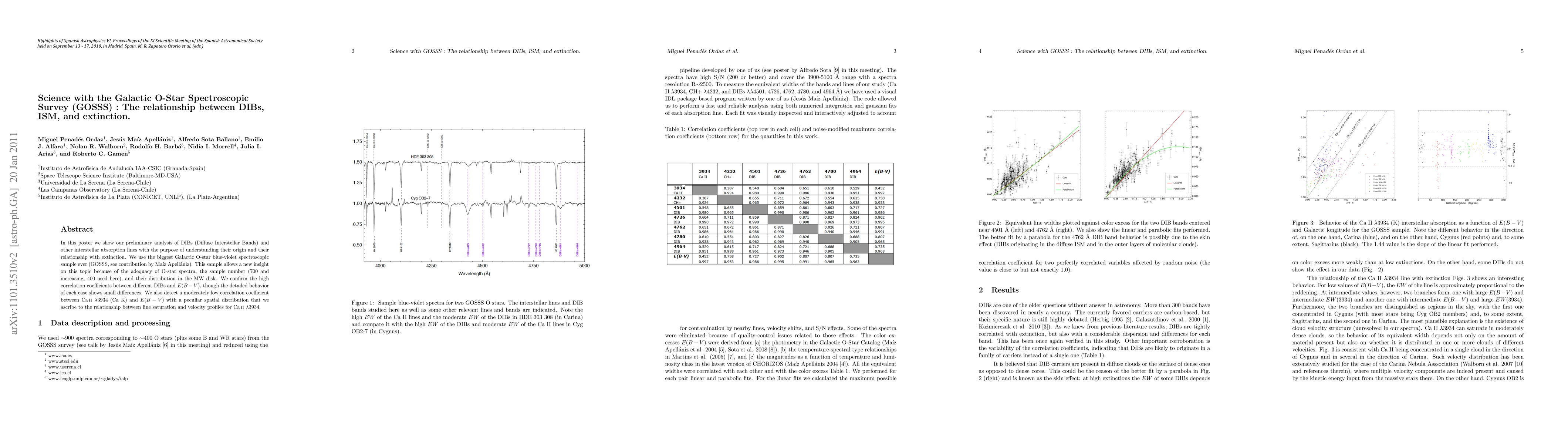 In this poster we show our preliminary analysis of DIBs (Diffuse Interstellar Bands) and other interstellar absorption lines with the purpose of understanding their origin and their relationship with extinction. We use the biggest Galactic O-star blue-violet spectroscopic sample ever (GOSSS, see contribution by Ma\'iz Apell\'aniz at this meeting). This sample allows a new insight on this topic because of the adequacy of O-star spectra, the sample number (700 and increasing, 400 used here), and their distribution in the MW disk. We confirm the high correlation coefficients between different DIBs and E(B - V), though the detailed behavior of each case shows small differences. We also detect a moderately low correlation coefficient between Ca II {\lambda}3934 (Ca K) and E(B - V) with a peculiar spatial distribution that we ascribe to the relationship between line saturation and velocity profiles for Ca II {\lambda}3934.