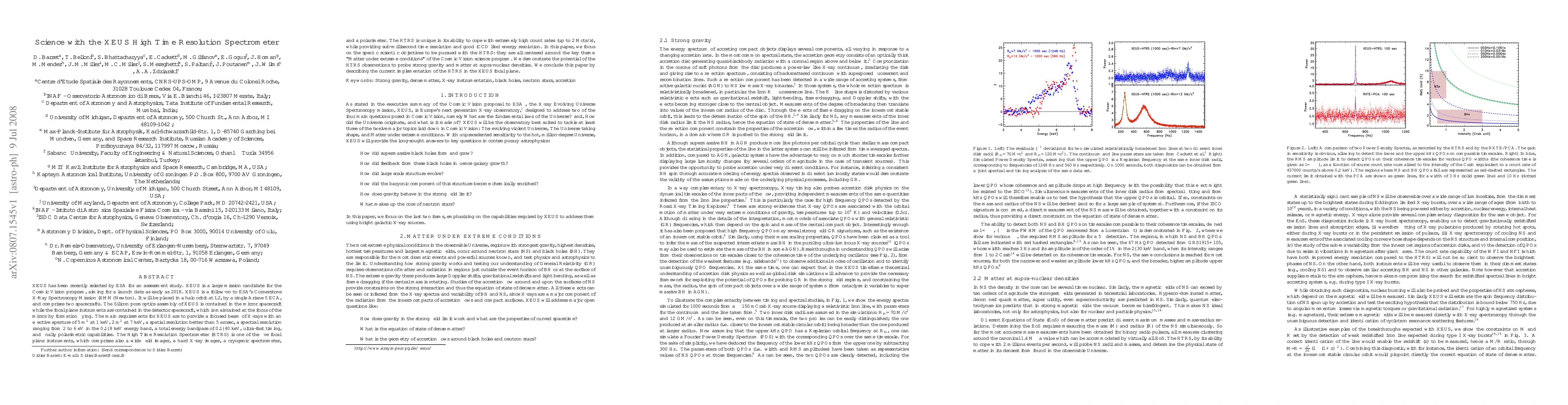XEUS has been recently selected by ESA for an assessment study. XEUS is a large mission candidate for the Cosmic Vision program, aiming for a launch date as early as 2018. XEUS is a follow-on to ESA's Cornerstone X-Ray Spectroscopy Mission (XMM-Newton). It will be placed in a halo orbit at L2, by a single Ariane 5 ECA, and comprises two spacecrafts. The Silicon pore optics assembly of XEUS is contained in the mirror spacecraft while the focal plane instruments are contained in the detector spacecraft, which is maintained at the focus of the mirror by formation flying. The main requirements for XEUS are to provide a focused beam of X-rays with an effective aperture of 5 m^2 at 1 keV, 2 m^2 at 7 keV, a spatial resolution better than 5 arcsec, a spectral resolution ranging from 2 to 6 eV in the 0.1-8 keV energy band, a total energy bandpass of 0.1-40 keV, ultra-fast timing, and finally polarimetric capabilities. The High Time Resolution Spectrometer (HTRS) is one of the five focal plane instruments, which comprises also a wide field imager, a hard X-ray imager, a cryogenic spectrometer, and a polarimeter. The HTRS is unique in its ability to cope with extremely high count rates (up to 2 Mcts/s), while providing sub-millisecond time resolution and good (CCD like) energy resolution. In this paper, we focus on the specific scientific objectives to be pursued with the HTRS: they are all centered around the key theme "Matter under extreme conditions" of the Cosmic Vision science program. We demonstrate the potential of the HTRS observations to probe strong gravity and matter at supra-nuclear densities. We conclude this paper by describing the current implementation of the HTRS in the XEUS focal plane.