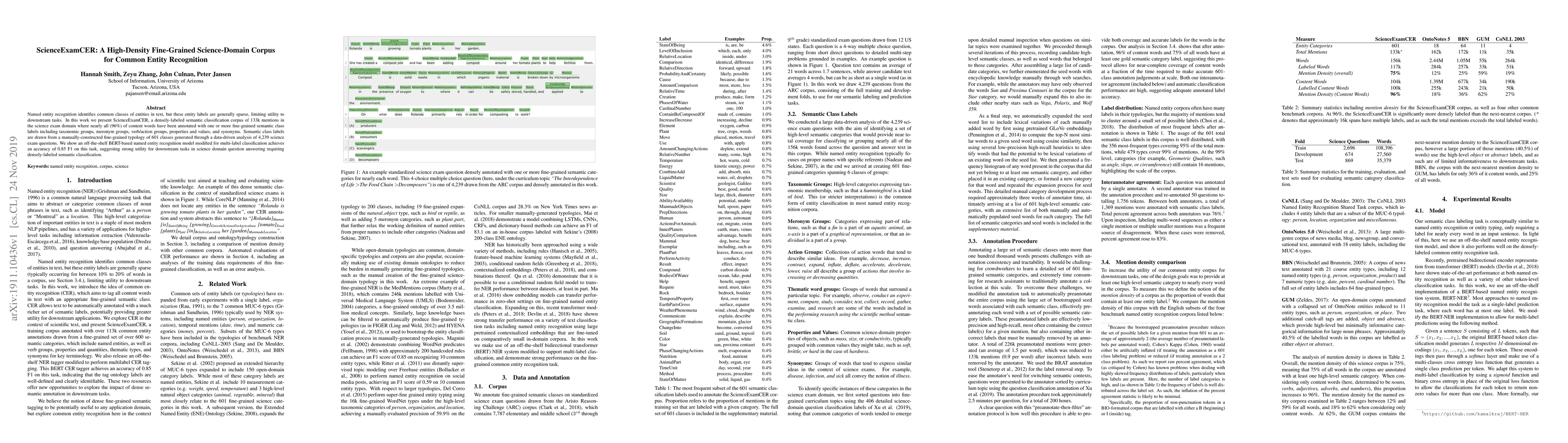 ScienceExamCER provides a densely-labeled science-domain corpus with fine-grained semantic class labels, facilitating improved named entity recognition. A BERT-based model achieves high accuracy, indicating its utility for science domain question answering.