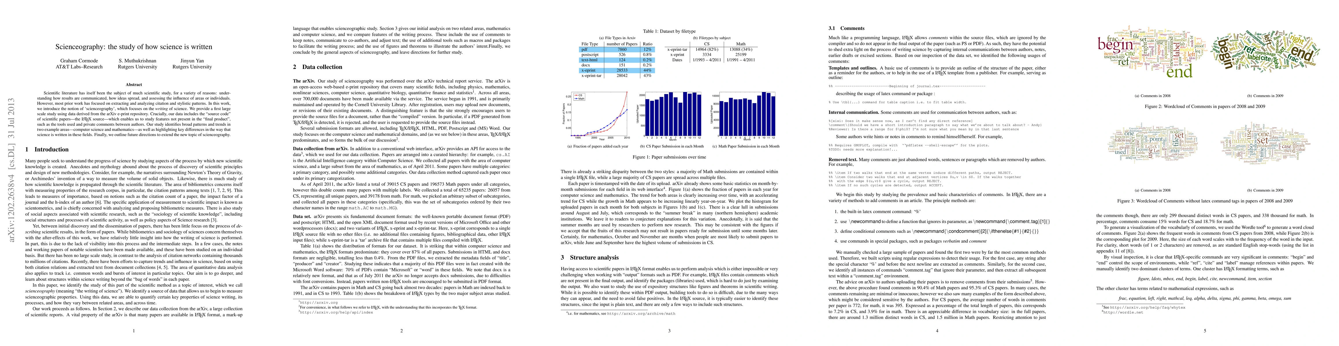 Scientific literature has itself been the subject of much scientific study, for a variety of reasons: understanding how results are communicated, how ideas spread, and assessing the influence of areas or individuals. However, most prior work has focused on extracting and analyzing citation and stylistic patterns. In this work, we introduce the notion of 'scienceography', which focuses on the writing of science. We provide a first large scale study using data derived from the arXiv e-print repository. Crucially, our data includes the "source code" of scientific papers-the LaTEX source-which enables us to study features not present in the "final product", such as the tools used and private comments between authors. Our study identifies broad patterns and trends in two example areas-computer science and mathematics-as well as highlighting key differences in the way that science is written in these fields. Finally, we outline future directions to extend the new topic of scienceography.