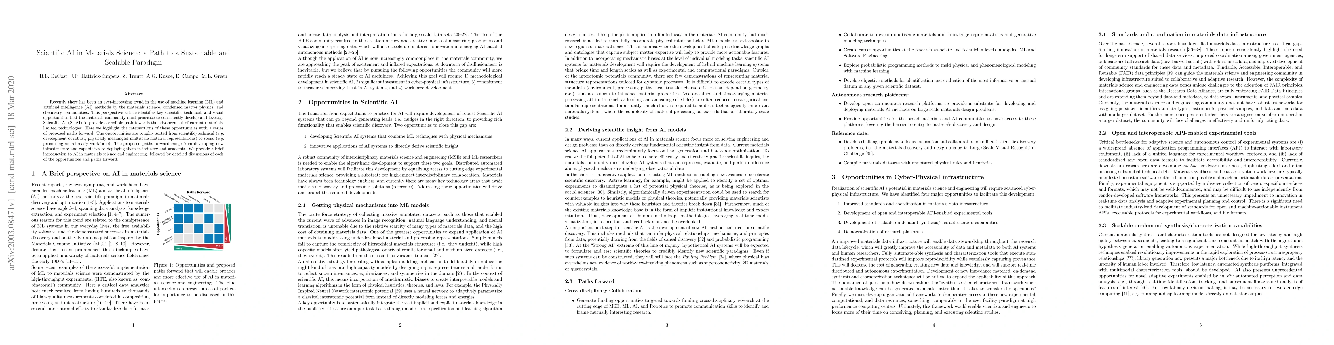 Recently there has been an ever-increasing trend in the use of machine learning (ML) and artificial intelligence (AI) methods by the materials science, condensed matter physics, and chemistry communities. This perspective article identifies key scientific, technical, and social opportunities that the materials community must prioritize to consistently develop and leverage Scientific AI to provide a credible path towards the advancement of current materials-limited technologies. Here we highlight the intersections of these opportunities with a series of proposed paths forward. The opportunities are roughly sorted from scientific/technical (e.g., development of robust, physically meaningful multiscale material representations) to social (e.g., promoting an AI-ready workforce). The proposed paths forward range from developing new infrastructure and capabilities to deploying them in industry and academia. We provide a brief introduction to AI in materials science and engineering, followed by detailed discussions of each of the opportunities and paths forward.
