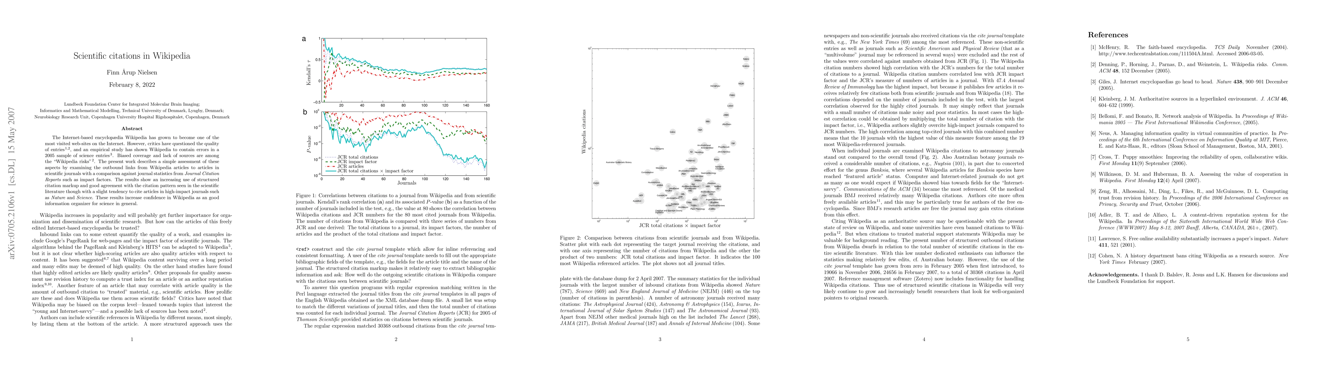 The Internet-based encyclopaedia Wikipedia has grown to become one of the most visited web-sites on the Internet. However, critics have questioned the quality of entries, and an empirical study has shown Wikipedia to contain errors in a 2005 sample of science entries. Biased coverage and lack of sources are among the "Wikipedia risks". The present work describes a simple assessment of these aspects by examining the outbound links from Wikipedia articles to articles in scientific journals with a comparison against journal statistics from Journal Citation Reports such as impact factors. The results show an increasing use of structured citation markup and good agreement with the citation pattern seen in the scientific literature though with a slight tendency to cite articles in high-impact journals such as Nature and Science. These results increase confidence in Wikipedia as an good information organizer for science in general.