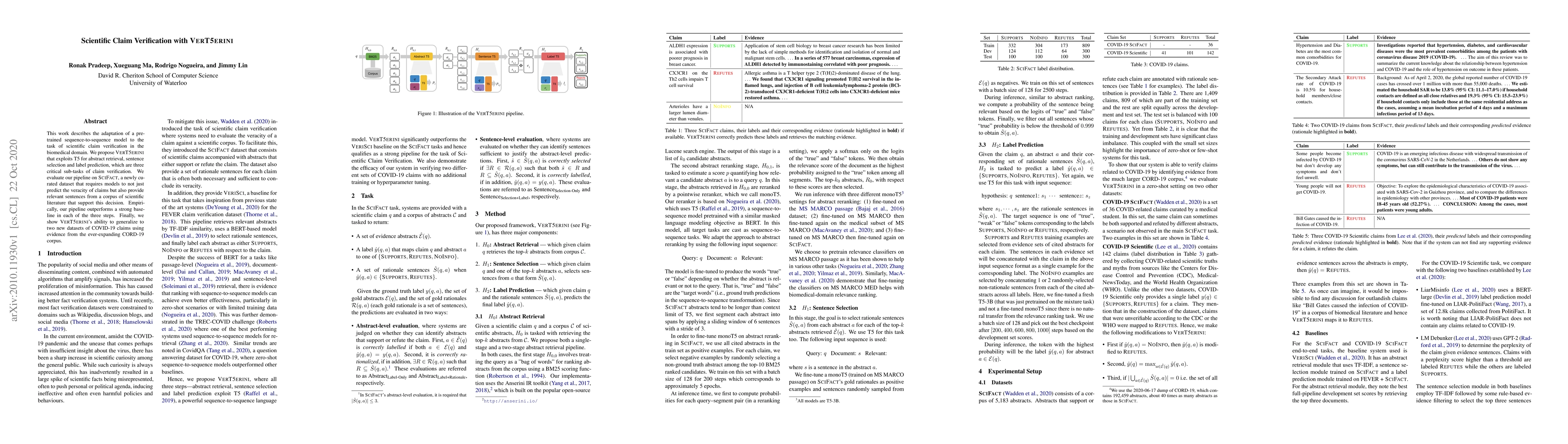 This research adapts a pretrained T5 model, VERT5ERINI, for scientific claim verification in biomedical literature, achieving superior performance in abstract retrieval, sentence selection, and label prediction compared to a baseline. The model demonstrates generalization to new COVID-19 claim datasets using evidence from the CORD-19 corpus.