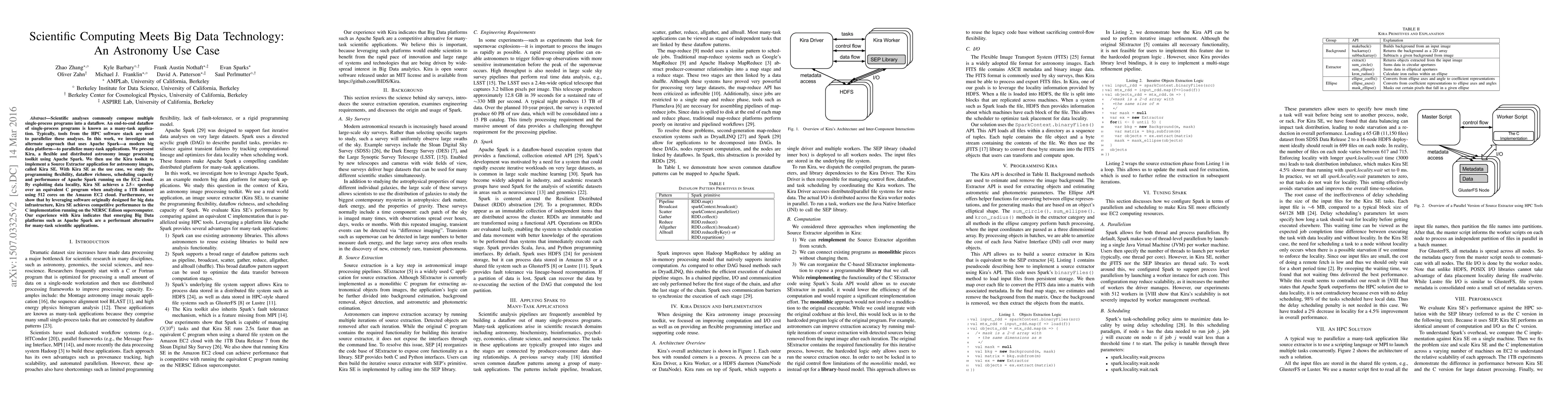 This paper explores using Apache Spark, a big data platform, to parallelize many-task scientific applications, presenting Kira SE for astronomy image processing. It demonstrates that Kira SE achieves a 2.5x speedup over a C program on Amazon EC2, indicating that big data platforms can be competitive alternatives for scientific computing.