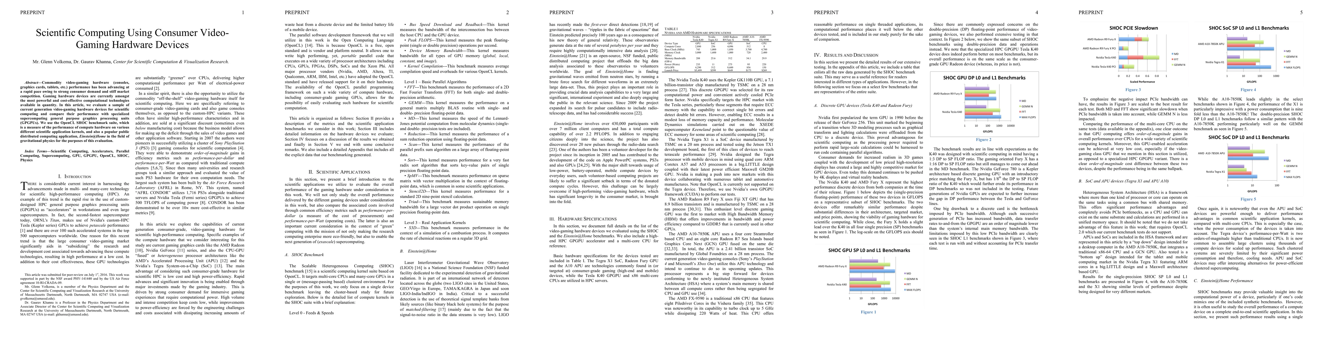 The paper evaluates current generation video-gaming hardware devices for scientific computing using the OpenCL SHOC benchmark suite and the Einstein@Home distributed computing application.